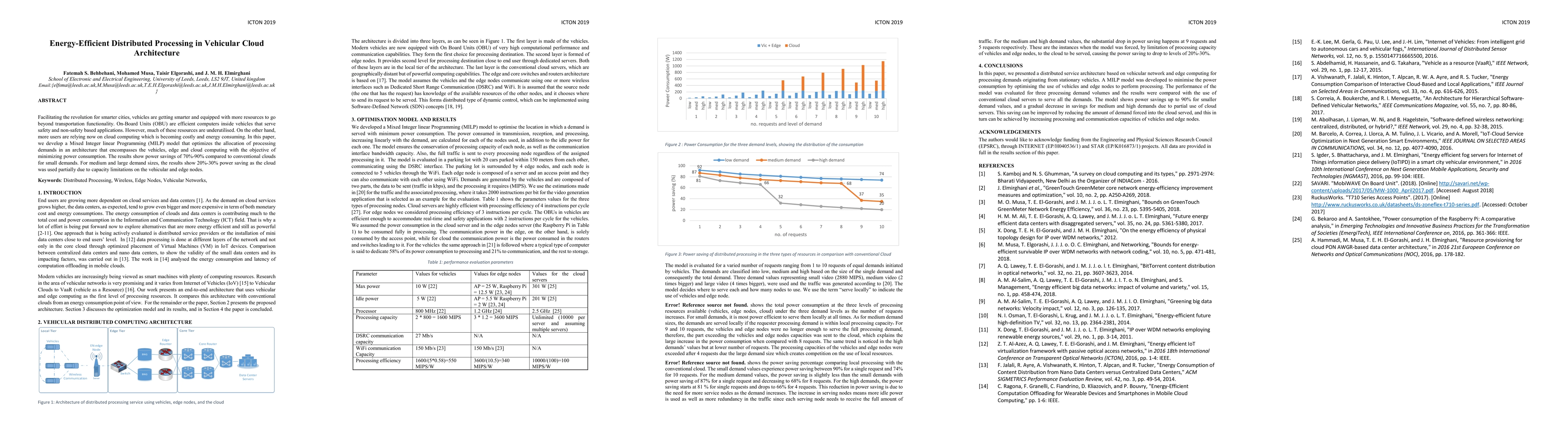 Facilitating the revolution for smarter cities, vehicles are getting smarter and equipped with more resources to go beyond transportation functionality. On-Board Units (OBU) are efficient computers inside vehicles that serve safety and non-safety based applications. However, much of these resources are underutilised. On the other hand, more users are relying now on cloud computing which is becoming costly and energy consuming. In this paper, we develop a Mixed Integer linear Programming (MILP) model that optimizes the allocation of processing demands in an architecture that encompasses the vehicles, edge and cloud computing with the objective of minimizing power consumption. The results show power savings of 70%-90% compared to conventional clouds for small demands. For medium and large demand sizes, the results show 20%-30% power saving as the cloud was used partially due to capacity limitations on the vehicular and edge nodes.