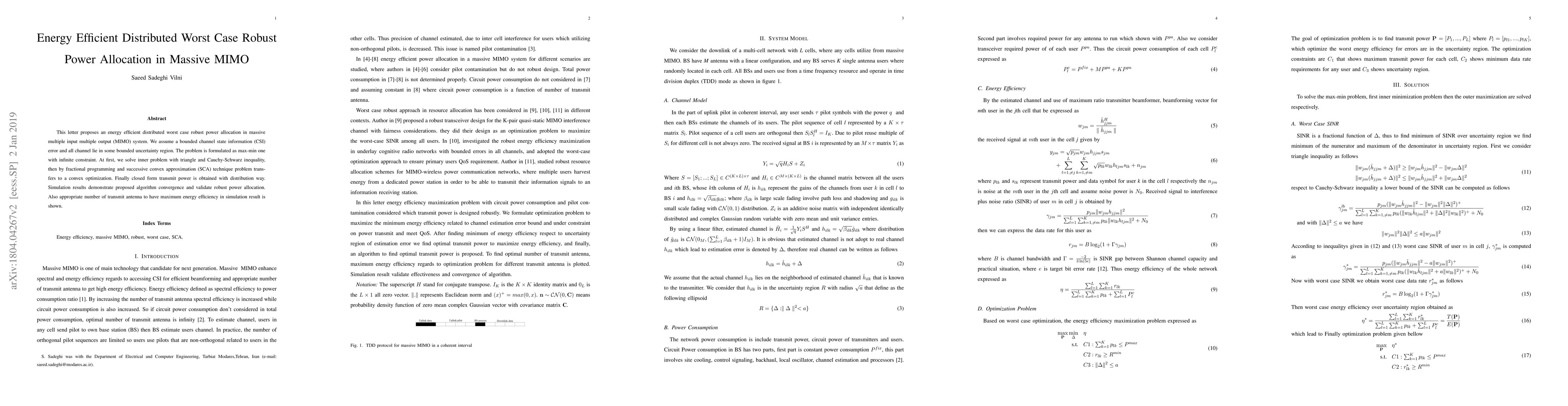 This letter proposes an energy efficient distributed worst case robust power allocation in massive multiple input multiple output (MIMO) system. We assume a bounded channel state information (CSI) error and all channels lie in some bounded uncertainty region. The problem is formulated as max-min one with infinite constraint. At first, we solve the inner problem with triangle and Cauchy-Schwarz inequality, then by fractional programming and successive convex approximation (SCA) technique problem transfers to a convex optimization. Finally closed form transmit power is obtained with distribution way. Simulation results demonstrate proposed algorithm convergence and validate robust power allocation. Also, the appropriate number of transmit antenna to have maximum energy efficiency in simulation result is shown.
