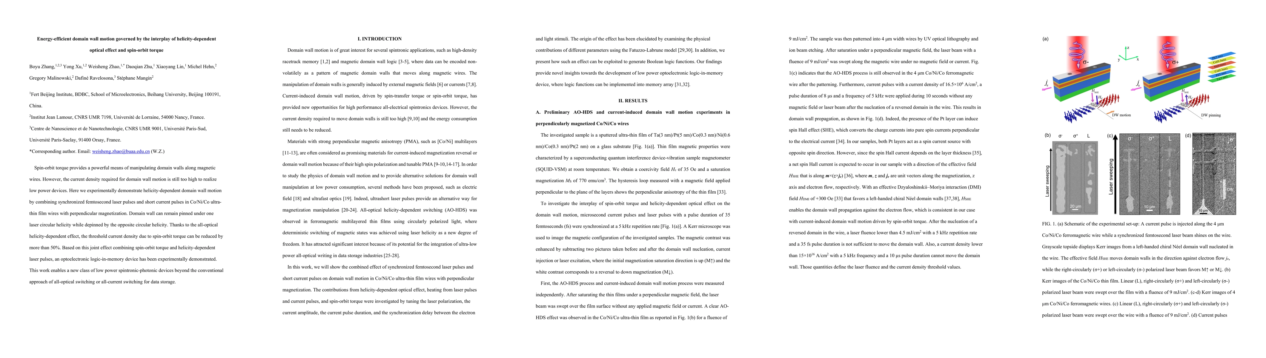 This research demonstrates that combining helicity-dependent optical effects with spin-orbit torque significantly reduces current density for domain wall motion in magnetic wires, achieving energy-efficient domain manipulation. An optoelectronic logic-in-memory device is also shown, highlighting potential for low power spintronic-photonic devices.