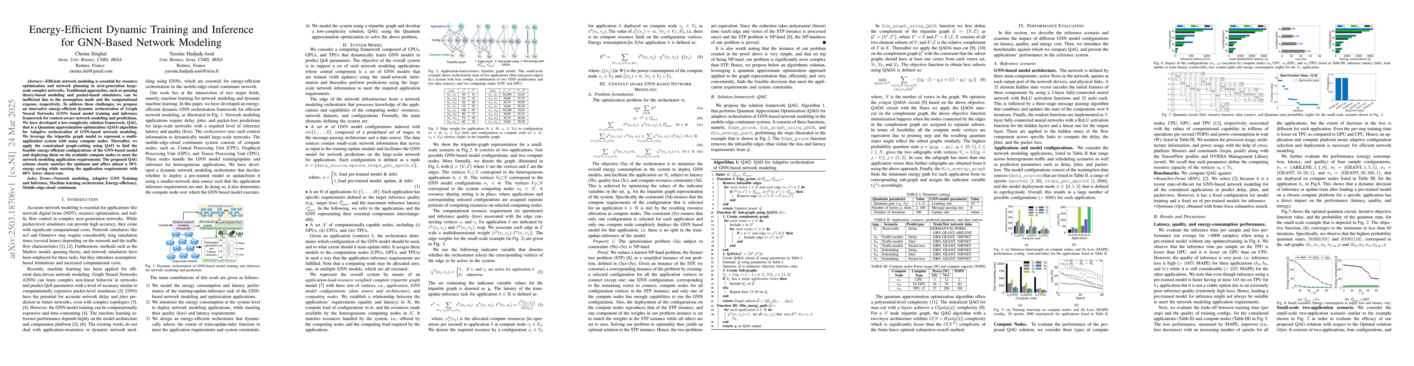 This paper proposes an energy-efficient dynamic training and inference framework for GNN-based network modeling using a Quantum approximation optimization algorithm (QAO). The QAG framework optimizes resource allocation and reduces energy consumption by 50% while achieving a 60% lower churn-rate.