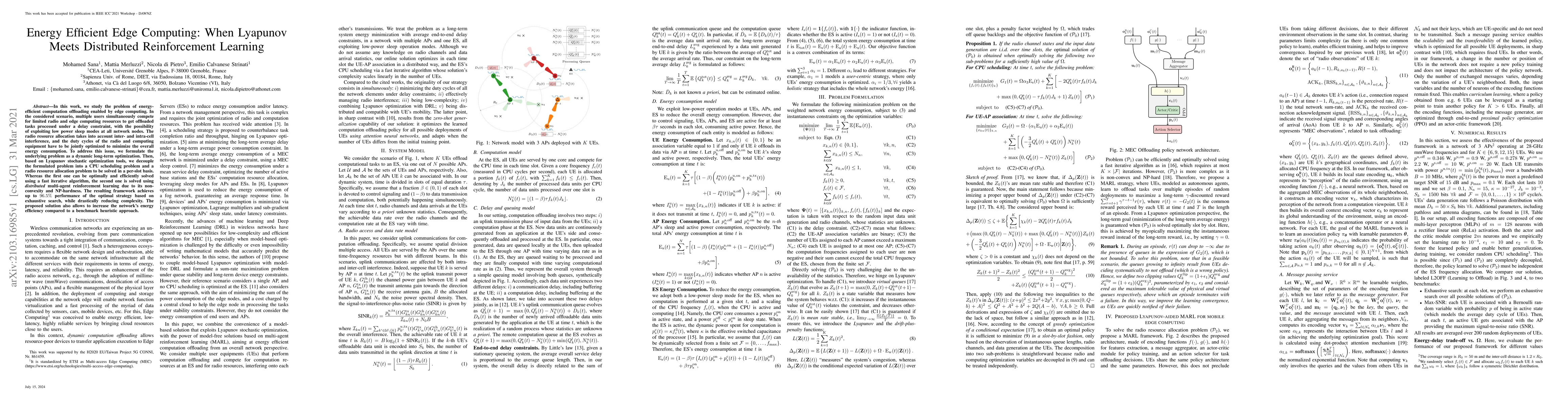 This paper proposes an energy-efficient edge computing framework using Lyapunov optimization and distributed reinforcement learning to manage resource allocation and minimize energy consumption under delay constraints. The approach achieves near-optimal performance with significantly reduced complexity compared to exhaustive search.