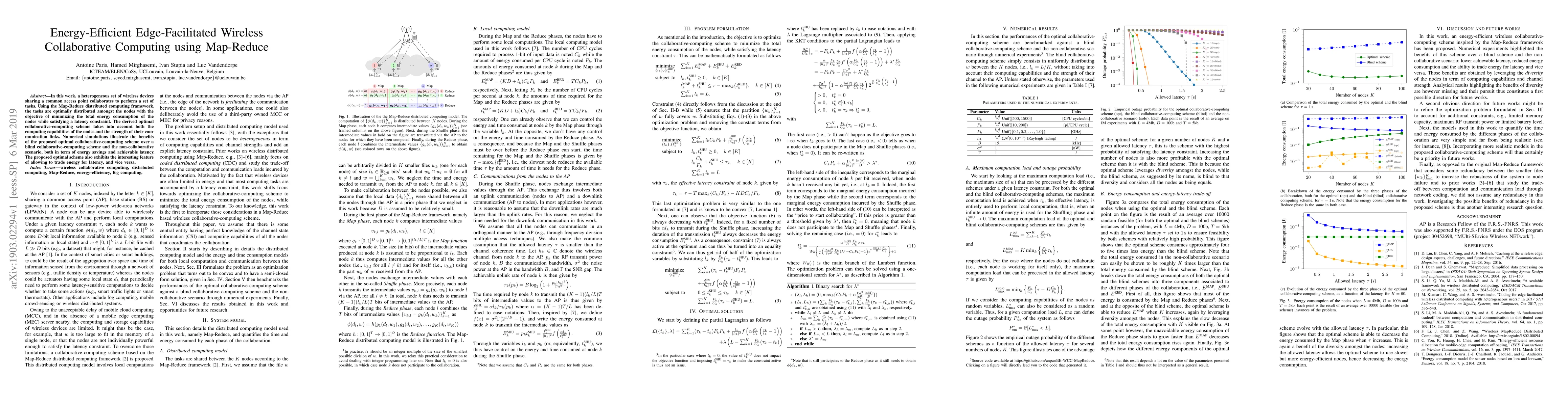 In this work, a heterogeneous set of wireless devices sharing a common access point collaborates to perform a set of tasks. Using the Map-Reduce distributed computing framework, the tasks are optimally distributed amongst the nodes with the objective of minimizing the total energy consumption of the nodes while satisfying a latency constraint. The derived optimal collaborative-computing scheme takes into account both the computing capabilities of the nodes and the strength of their communication links. Numerical simulations illustrate the benefits of the proposed optimal collaborative-computing scheme over a blind collaborative-computing scheme and the non-collaborative scenario, both in term of energy savings and achievable latency. The proposed optimal scheme also exhibits the interesting feature of allowing to trade energy for latency, and vice versa.