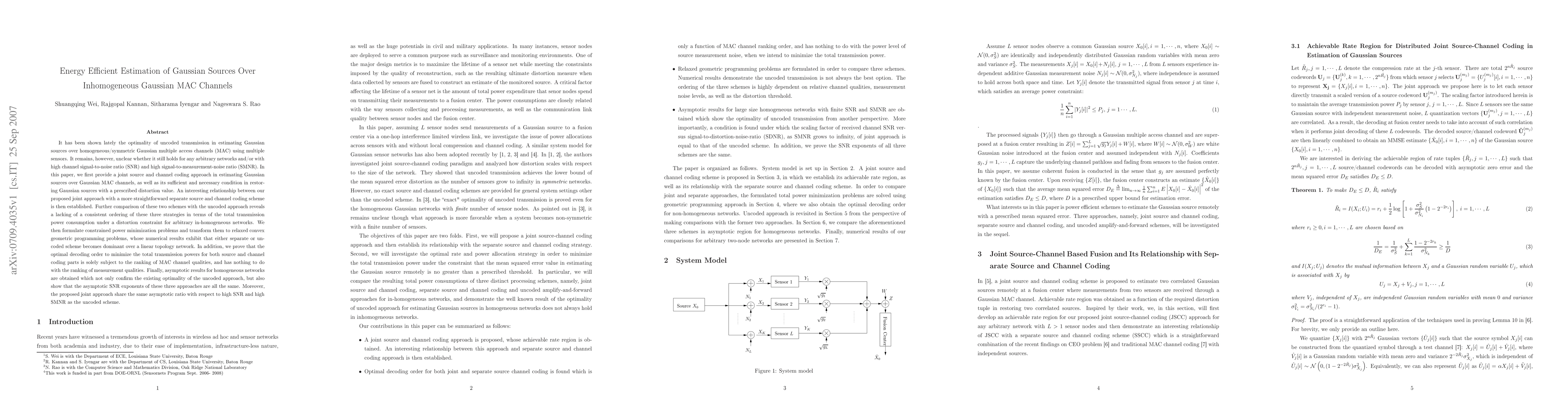 It has been shown lately the optimality of uncoded transmission in estimating Gaussian sources over homogeneous/symmetric Gaussian multiple access channels (MAC) using multiple sensors. It remains, however, unclear whether it still holds for any arbitrary networks and/or with high channel signal-to-noise ratio (SNR) and high signal-to-measurement-noise ratio (SMNR). In this paper, we first provide a joint source and channel coding approach in estimating Gaussian sources over Gaussian MAC channels, as well as its sufficient and necessary condition in restoring Gaussian sources with a prescribed distortion value. An interesting relationship between our proposed joint approach with a more straightforward separate source and channel coding scheme is then established. We then formulate constrained power minimization problems and transform them to relaxed convex geometric programming problems, whose numerical results exhibit that either separate or uncoded scheme becomes dominant over a linear topology network. In addition, we prove that the optimal decoding order to minimize the total transmission powers for both source and channel coding parts is solely subject to the ranking of MAC channel qualities, and has nothing to do with the ranking of measurement qualities. Finally, asymptotic results for homogeneous networks are obtained which not only confirm the existing optimality of the uncoded approach, but also show that the asymptotic SNR exponents of these three approaches are all the same. Moreover, the proposed joint approach share the same asymptotic ratio with respect to high SNR and high SMNR as the uncoded scheme.