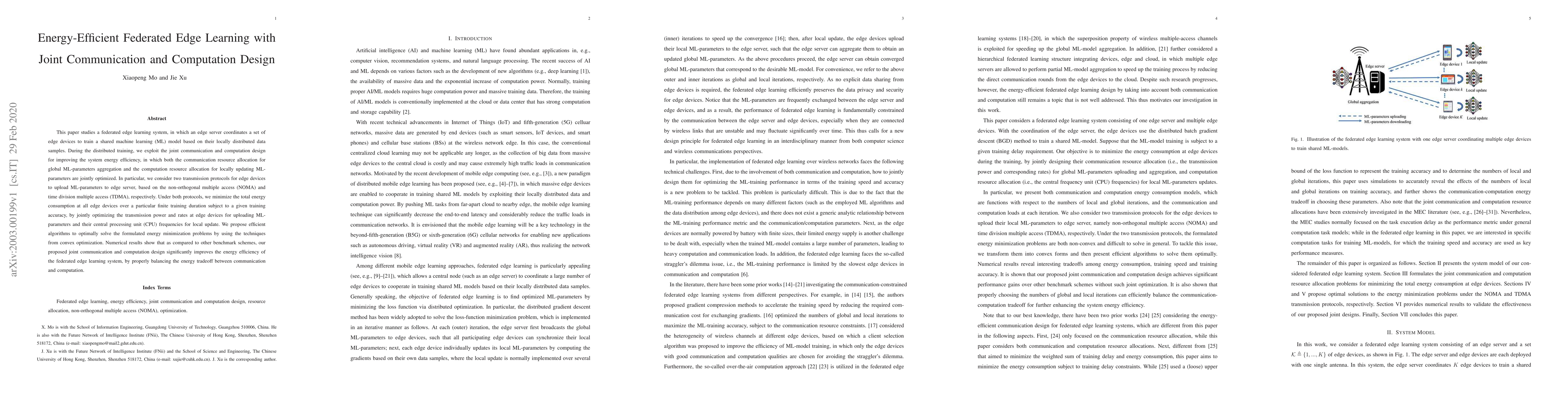 This paper proposes an energy-efficient federated edge learning system that optimizes both communication and computation resources to minimize energy consumption. It employs joint communication and computation design, leveraging non-orthogonal multiple access and time division multiple access protocols, and uses convex optimization techniques to achieve optimal energy efficiency.