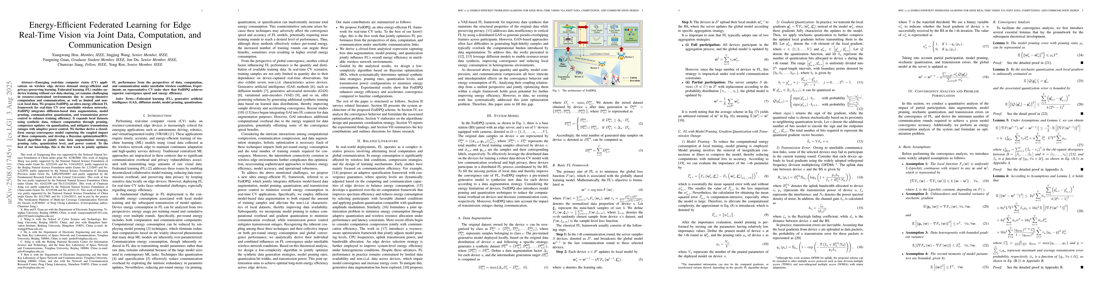 Emerging real-time computer vision (CV) applications on wireless edge devices demand energy-efficient and privacy-preserving learning. Federated learning (FL) enables on-device training without raw data sharing, yet remains challenging in resource-constrained environments due to energy-intensive computation and communication, as well as limited and non-i.i.d. local data. We propose FedDPQ, an ultra energy-efficient FL framework for real-time CV over unreliable wireless networks. FedDPQ integrates diffusion-based data augmentation, model pruning, communication quantization, and transmission power control to enhance training efficiency. It expands local datasets using synthetic data, reduces computation through pruning, compresses updates via quantization, and mitigates transmission outages with adaptive power control. We further derive a closed-form energy-convergence model capturing the coupled impact of these components, and develop a Bayesian optimization(BO)-based algorithm to jointly tune data augmentation strategy, pruning ratio, quantization level, and power control. To the best of our knowledge, this is the first work to jointly optimize FL performance from the perspectives of data, computation, and communication under unreliable wireless conditions. Experiments on representative CV tasks show that FedDPQ achieves superior convergence speed and energy efficiency.