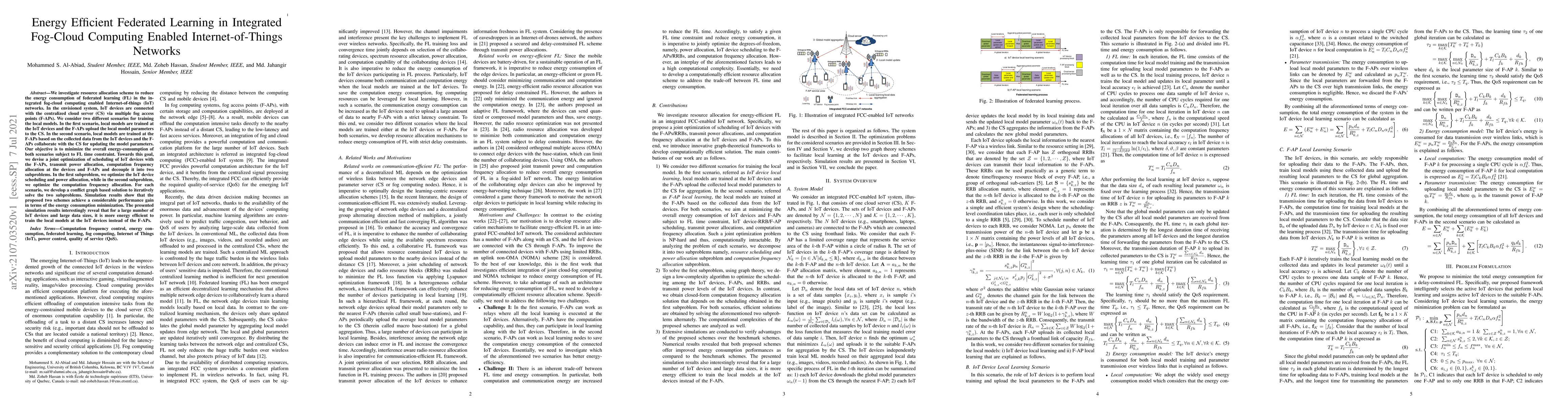This paper proposes resource allocation schemes to minimize energy consumption in federated learning across integrated fog-cloud IoT networks. It evaluates two training scenarios: local model training at IoT devices or fog access points, and develops optimization methods for scheduling, power, and computation frequency allocation. Simulation results indicate that training models locally on IoT devices is more energy efficient for large numbers of devices and data sizes.
