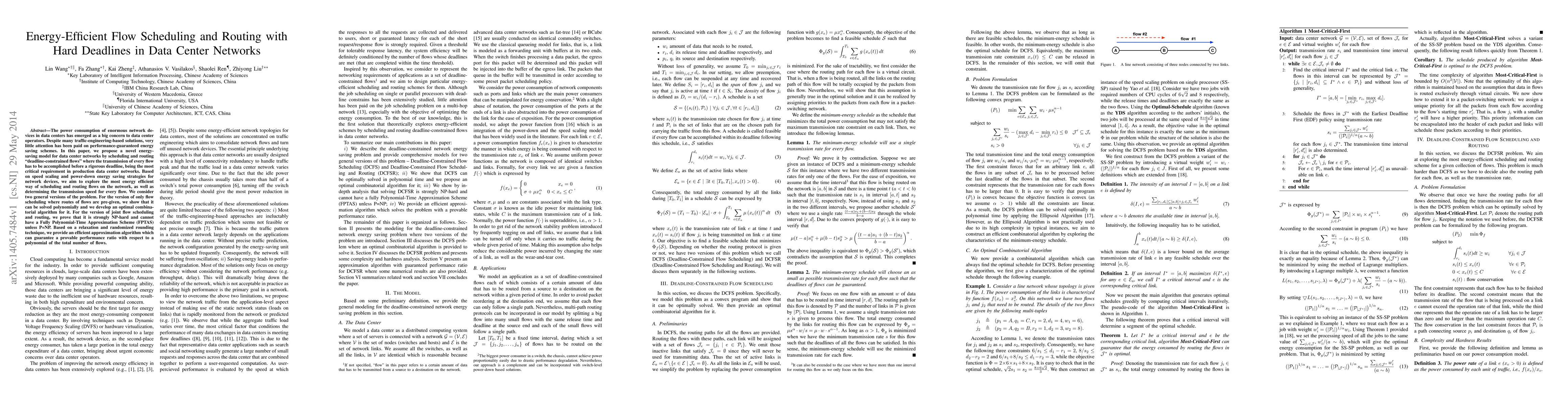 This paper proposes an energy-efficient model for scheduling and routing deadline-constrained flows in data center networks, focusing on minimizing power consumption. It presents a polynomially solvable algorithm for flow scheduling with pre-given routes and an efficient approximation algorithm for the joint scheduling and routing problem, which is proven to be strongly NP-hard.