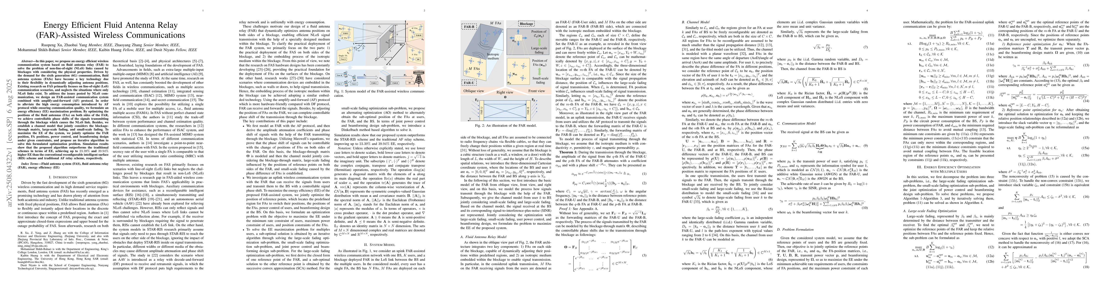In this paper, we propose an energy efficient wireless communication system based on fluid antenna relay (FAR) to solve the problem of non-line-of-sight (NLoS) links caused by blockages with considering the physical properties. Driven by the demand for the sixth generation (6G) communication, fluid antenna systems (FASs) have become a key technology due to their flexibility in dynamically adjusting antenna positions. Existing research on FAS primarily focuses on line-of-sight (LoS) communication scenarios, and neglects the situations where only NLoS links exist. To address the issues posted by NLoS communication, we design an FAR-assisted communication system combined with amplify-and-forward (AF) protocol. In order to alleviate the high energy consumption introduced by AF protocol while ensuring communication quality, we formulate an energy efficiency (EE) maximization problem. By optimizing the positions of the fluid antennas (FAs) on both sides of the FAR, we achieve controllable phase shifts of the signals transmitting through the blockage which causes the NLoS link. Besides, we establish a channel model that jointly considers the blockage-through matrix, large-scale fading, and small-scale fading. To maximize the EE of the system, we jointly optimize the FAR position, FA positions, power control, and beamforming design under given constraints, and propose an iterative algorithm to solve this formulated optimization problem. Simulation results show that the proposed algorithm outperforms the traditional schemes in terms of EE, achieving up to $23.39\%$ and $39.94\%$ higher EE than the conventional reconfigurable intelligent surface (RIS) scheme and traditional AF relay scheme, respectively.