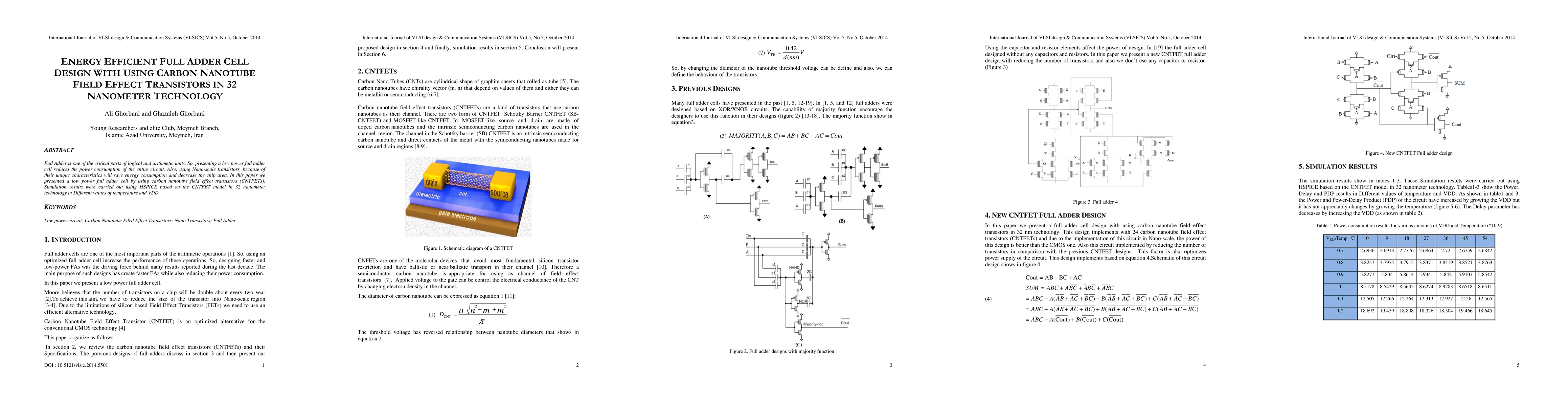 This paper proposes a low power full adder cell using carbon nanotube field effect transistors (CNTFETs) to reduce power consumption and chip area. Simulation results using HSPICE in 32 nanometer technology show effective energy efficiency across varying temperatures and supply voltages.
