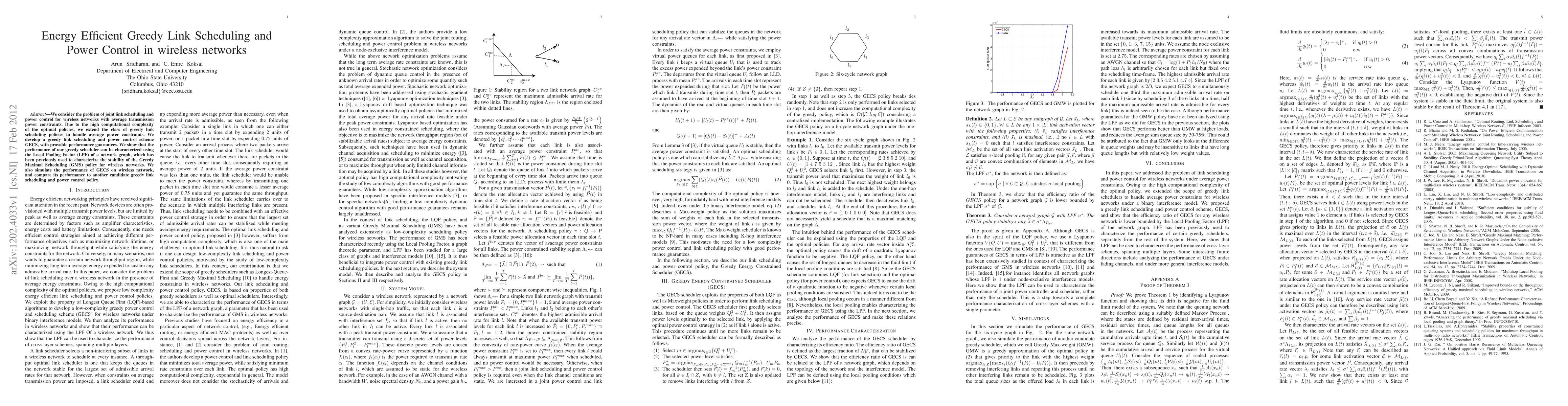 This paper proposes a greedy link scheduling and power control scheme, GECS, for wireless networks to manage average transmission power constraints. The authors provide performance guarantees using the Local Pooling Factor (LPF) and compare GECS's performance to another greedy policy through simulations.