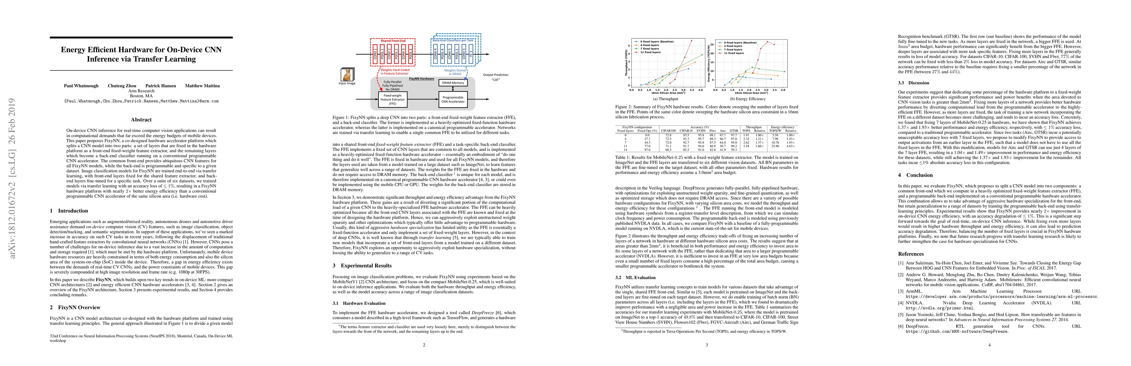 This paper introduces FixyNN, a hardware accelerator for on-device CNN inference that splits models into fixed and programmable parts, achieving nearly double the energy efficiency compared to conventional accelerators while maintaining <1% accuracy loss. Transfer learning is used to train the models end-to-end.