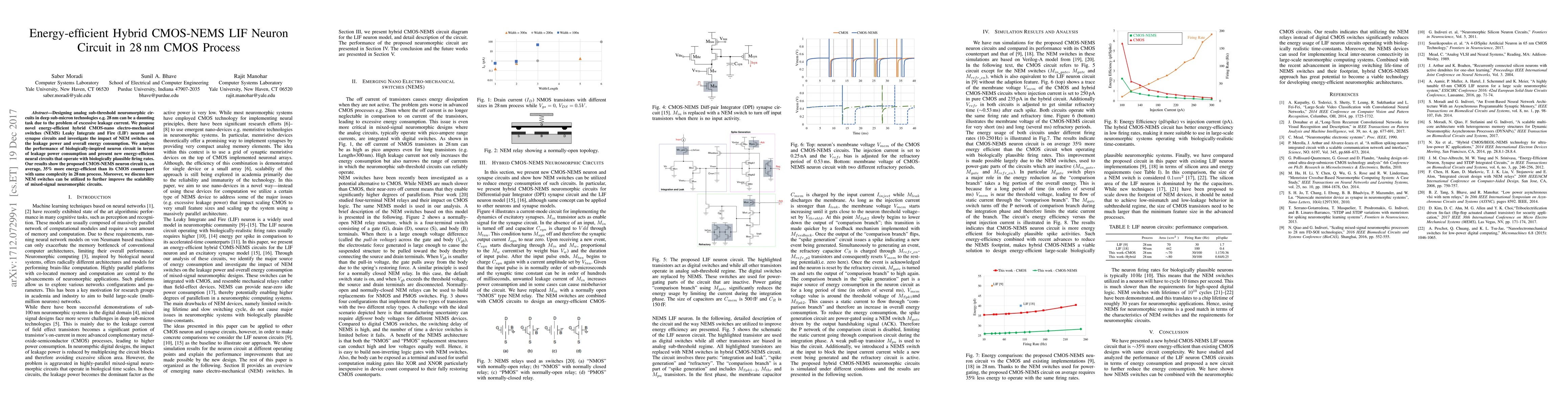 This paper proposes an energy-efficient hybrid CMOS-NEMS Leaky Integrate and Fire (LIF) neuron circuit in a 28 nm CMOS process, demonstrating a 35% improvement over traditional CMOS circuits due to the use of nano-electro-mechanical switches to reduce leakage power. The study highlights the potential of NEMS to enhance the scalability of neuromorphic circuits.