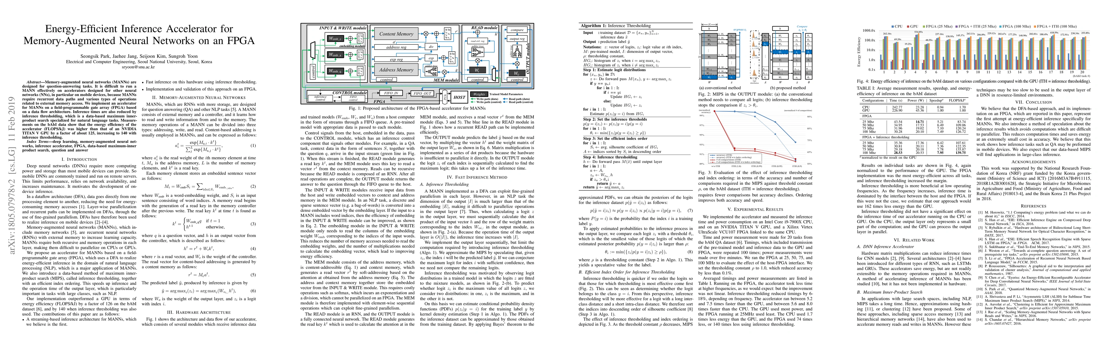 Memory-augmented neural networks (MANNs) are designed for question-answering tasks. It is difficult to run a MANN effectively on accelerators designed for other neural networks (NNs), in particular on mobile devices, because MANNs require recurrent data paths and various types of operations related to external memory access. We implement an accelerator for MANNs on a field-programmable gate array (FPGA) based on a data flow architecture. Inference times are also reduced by inference thresholding, which is a data-based maximum inner-product search specialized for natural language tasks. Measurements on the bAbI data show that the energy efficiency of the accelerator (FLOPS/kJ) was higher than that of an NVIDIA TITAN V GPU by a factor of about 125, increasing to 140 with inference thresholding