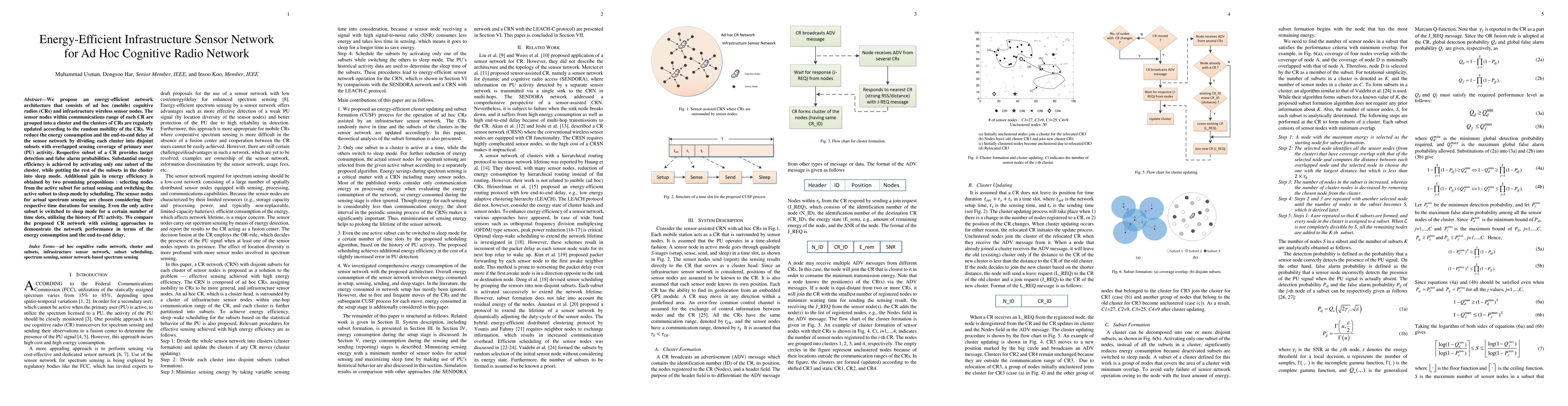 This paper proposes an energy-efficient network architecture using mobile cognitive radios and infrastructure sensor nodes, where clusters of radios dynamically adjust based on mobility. The network reduces energy consumption and delay by activating only one subset of each cluster while putting others to sleep, optimizing sensor network performance.