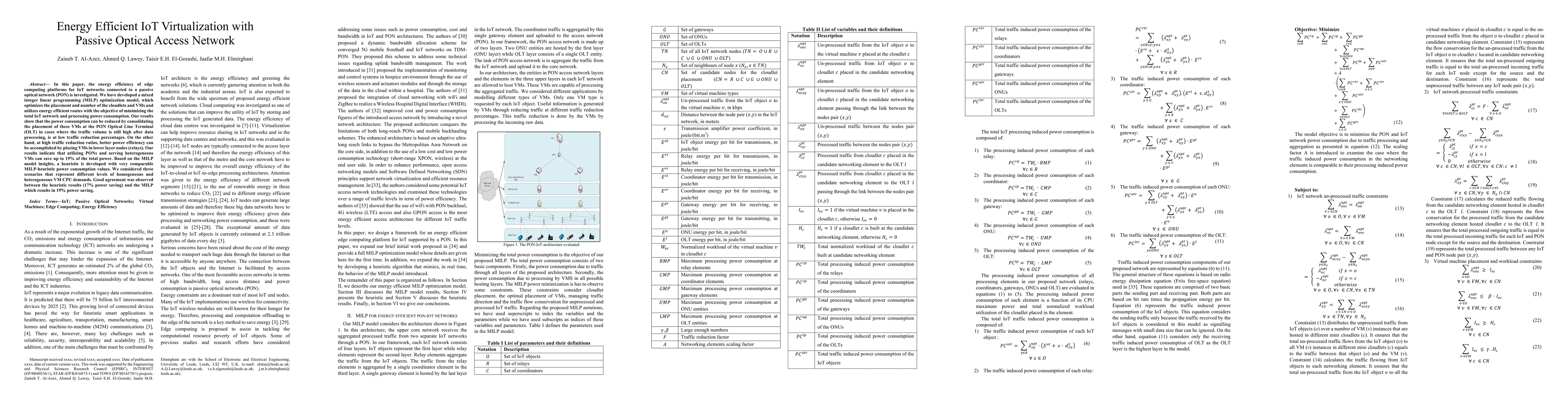 In this paper, the energy efficiency of edge computing platforms for IoT networks connected to a passive optical network (PON) is investigated. We have developed a mixed integer linear programming (MILP) optimization model, which optimizes the placement and number of the cloudlets and VMs and utilizes energy efficient routes with the objective of minimizing the total IoT network and processing power consumption. Our results show that the power consumption can be reduced by consolidating the placement of these VMs at the PON Optical Line Terminal (OLT) in cases where the traffic volume is still high after data processing, ie at low traffic reduction percentages. On the other hand, at high traffic reduction ratios, better power efficiency can be accomplished by placing VMs in lower layer nodes (relays). Our results indicate that utilizing PONs and serving heterogeneous VMs can save up to 19% of the total power. Based on the MILP model insights, a heuristic is developed with very comparable MILP-heuristic power consumption values. We considered three scenarios that represent different levels of homogeneous and heterogeneous VM CPU demands. Good agreement was observed between the heuristic results (17% power saving) and the MILP which results in 19% power saving.