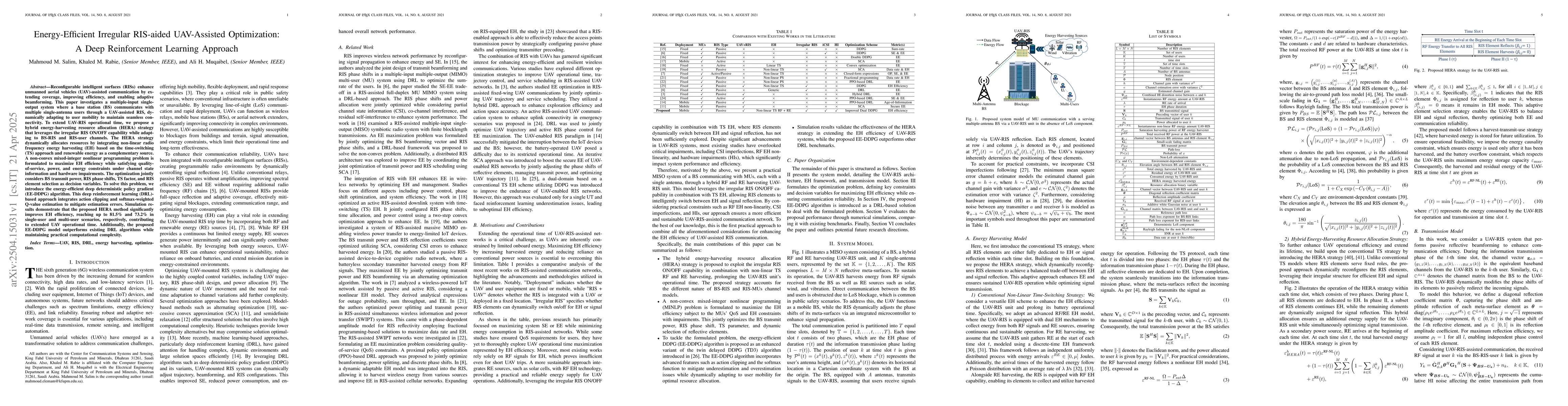 The research employs a deep reinforcement learning (DRL) approach, specifically the energy-efficient deep deterministic policy gradient (EE-DDPG) algorithm, to optimize a multiple-input single-output (MISO) system where a base station (BS) communicates with multiple single-antenna users through a UAV-assisted reconfigurable intelligent surface (RIS). The system dynamically adapts to user mobility, leveraging the irregular RIS ON/OFF capability and integrating non-linear radio frequency energy harvesting (EH) with renewable energy as a complementary source.