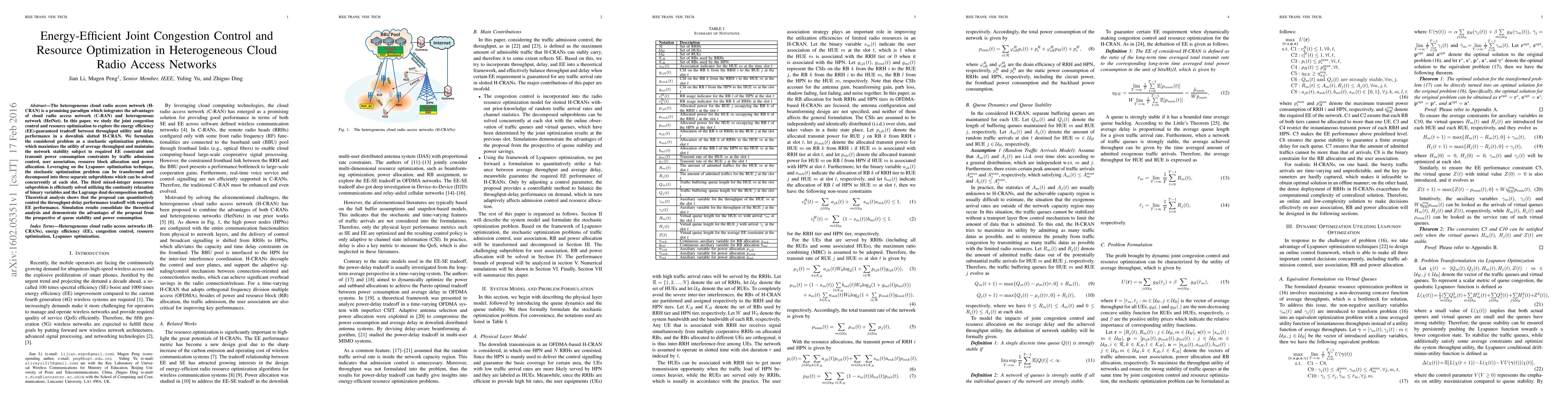This paper proposes a joint congestion control and resource optimization strategy in heterogeneous cloud radio access networks (HCRAN) to maximize throughput utility while ensuring energy efficiency and network stability. Using Lyapunov optimization and decomposition techniques, the problem is solved in a way that balances throughput-delay performance and meets energy constraints.