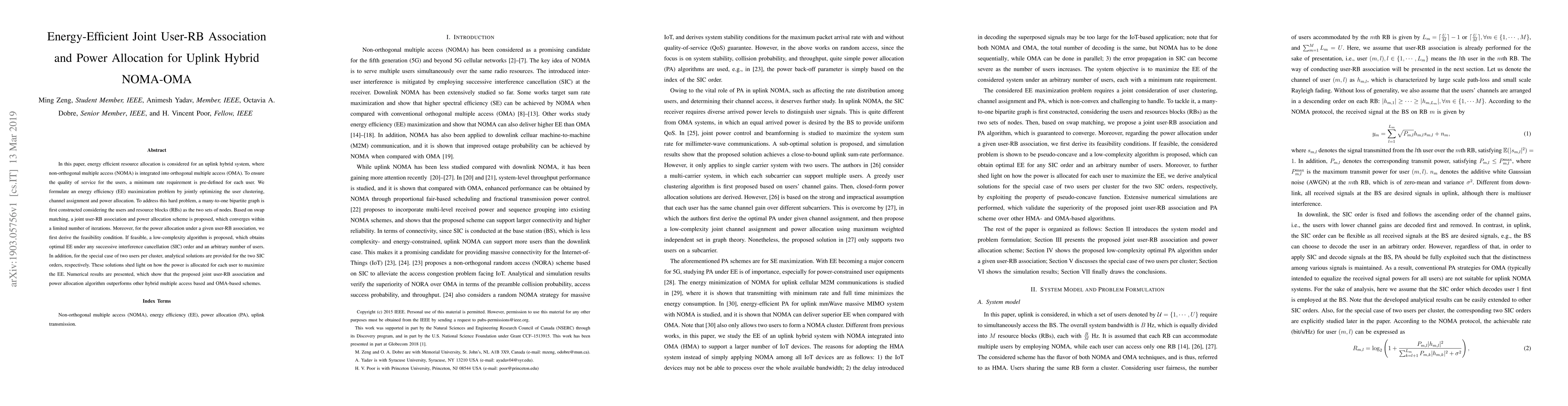 This paper proposes an energy-efficient joint user-RB association and power allocation scheme for an uplink hybrid NOMA-OMA system, optimizing user clustering, channel assignment, and power allocation to maximize energy efficiency. The proposed algorithm converges within a limited number of iterations and provides optimal EE under any interference cancellation order.