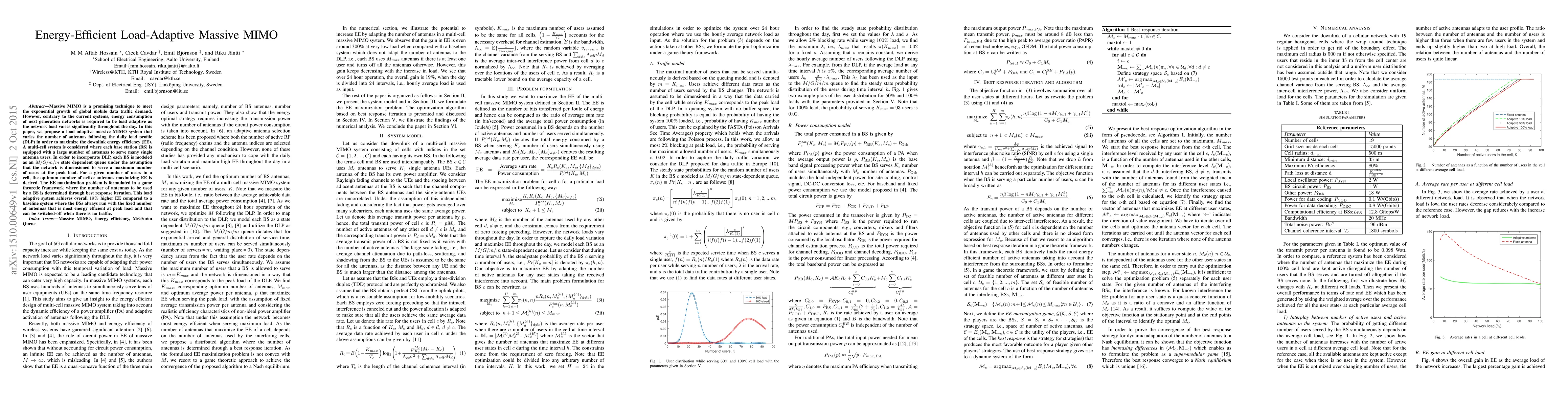 This paper proposes a load adaptive massive MIMO system that adjusts the number of active antennas based on the daily load profile, aiming to maximize downlink energy efficiency. The system achieves 19% higher energy efficiency compared to a fixed-antenna baseline system by employing a game theoretic framework for optimal antenna allocation.