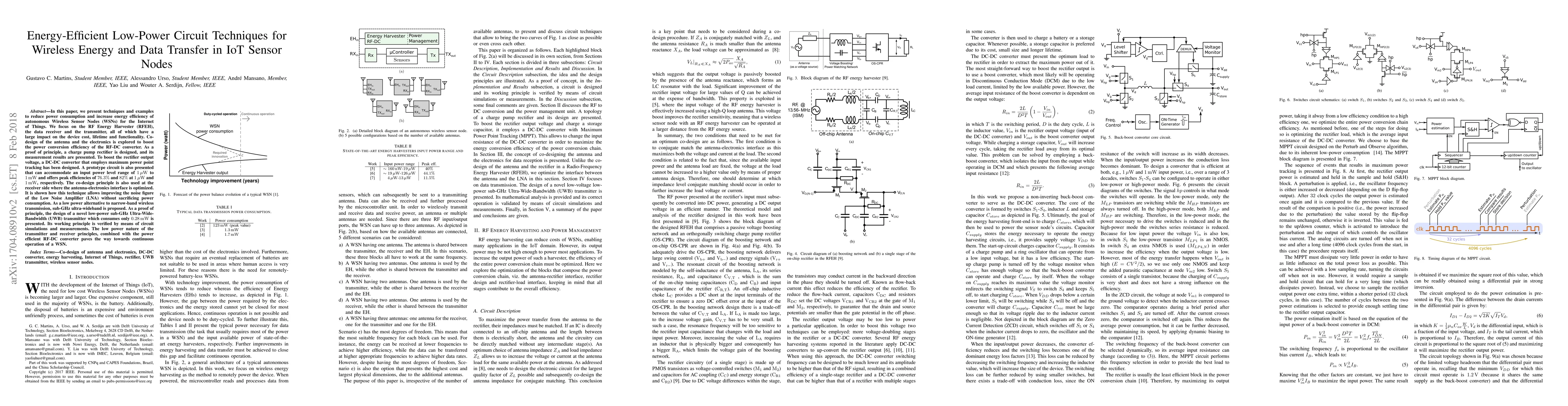 This paper explores techniques to reduce power consumption and enhance energy efficiency in IoT sensor nodes, focusing on the RF Energy Harvester, data receiver, and transmitter. A co-designed antenna and electronics approach boosts the RF-DC converter efficiency, and a novel low-power sub-GHz Ultra-Wideband transmitter consuming only 0.28 mW is presented, enabling continuous operation of Wireless Sensor Networks.