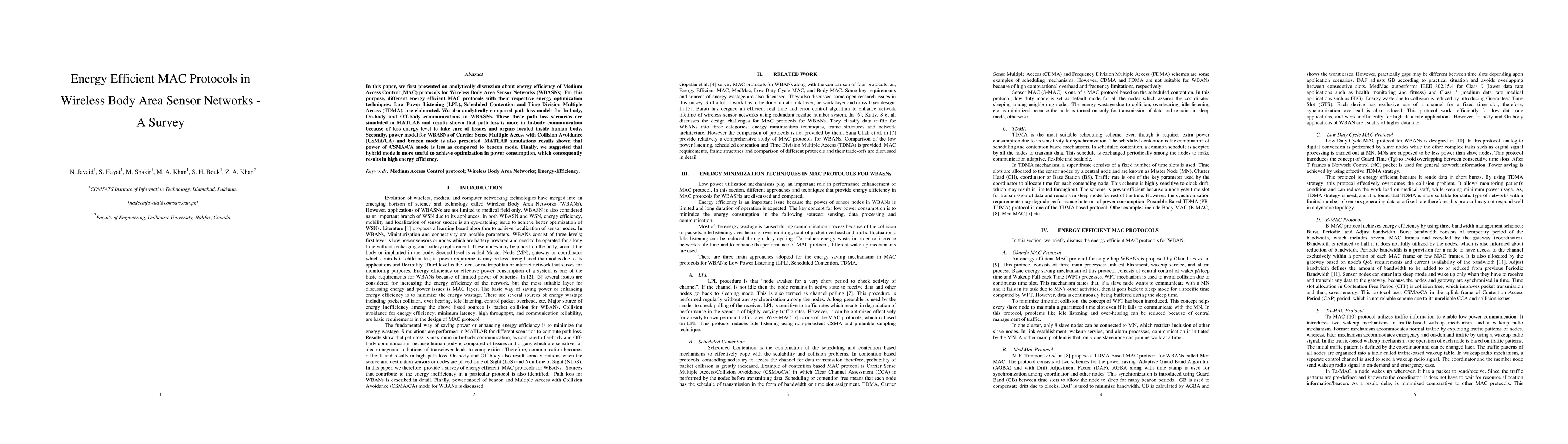 This paper surveys energy-efficient Medium Access Control (MAC) protocols for Wireless Body Area Sensor Networks (WBASNs), comparing techniques like Low Power Listening (LPL), Scheduled Contention, and Time Division Multiple Access (TDMA). MATLAB simulations show that In-body communication incurs higher path loss due to tissue and organ interference, while CSMA/CA mode consumes less power than beacon mode, suggesting hybrid modes for optimal power consumption and energy efficiency.