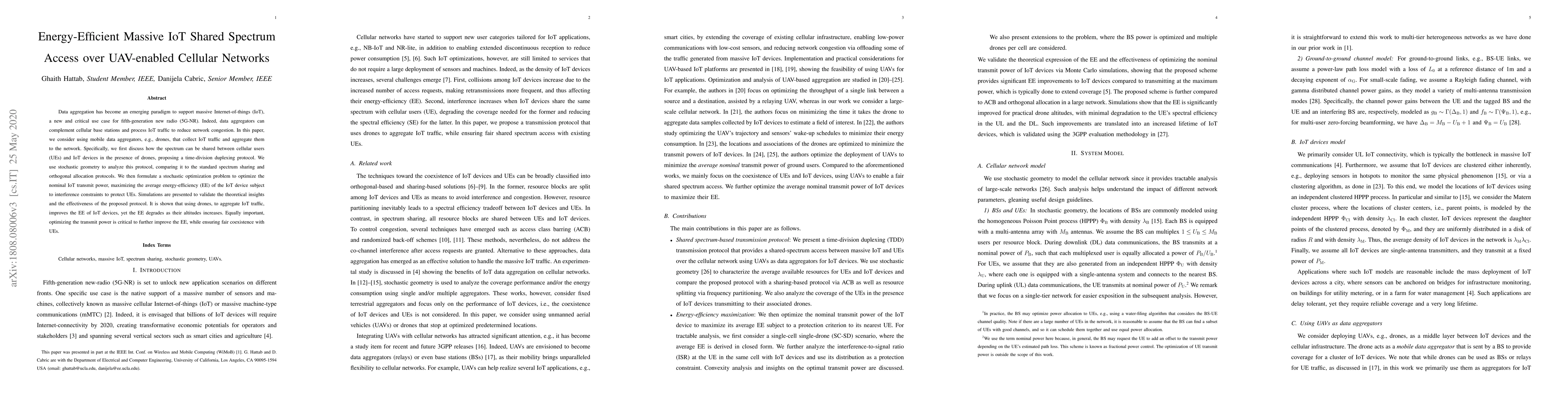 This paper explores energy-efficient spectrum access for massive IoT using UAVs, proposing a time-division duplexing protocol for shared spectrum between cellular users and IoT devices. The study optimizes IoT transmit power to maximize energy efficiency while ensuring fair coexistence, demonstrating improved efficiency through drone-based data aggregation.