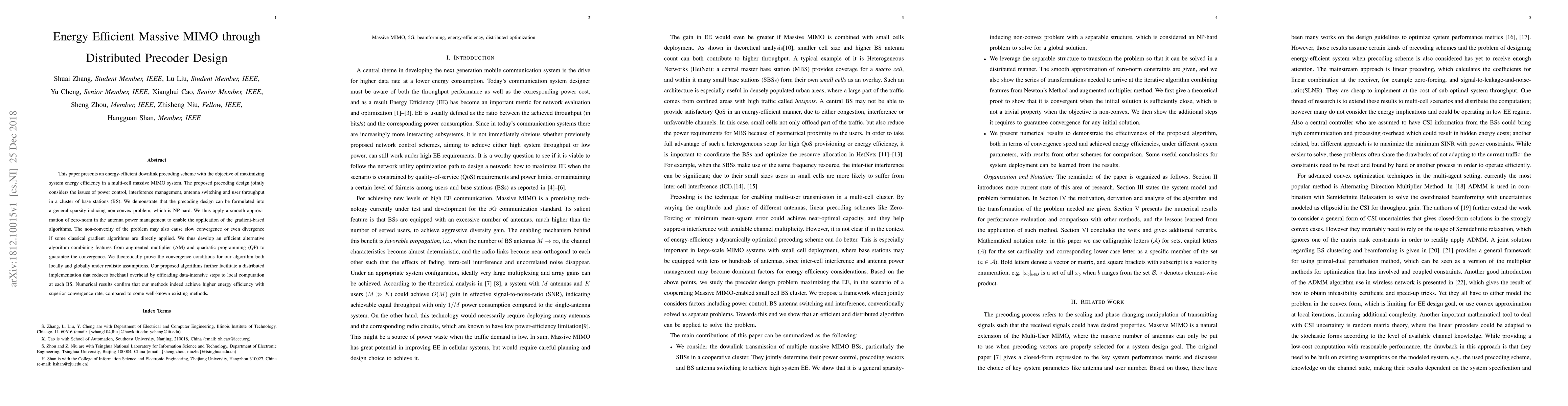 A new approach to energy-efficient massive MIMO systems is proposed, using distributed precoder design that balances power control, interference management, and user throughput in a cluster of base stations, achieving higher efficiency and faster convergence rates than existing methods.