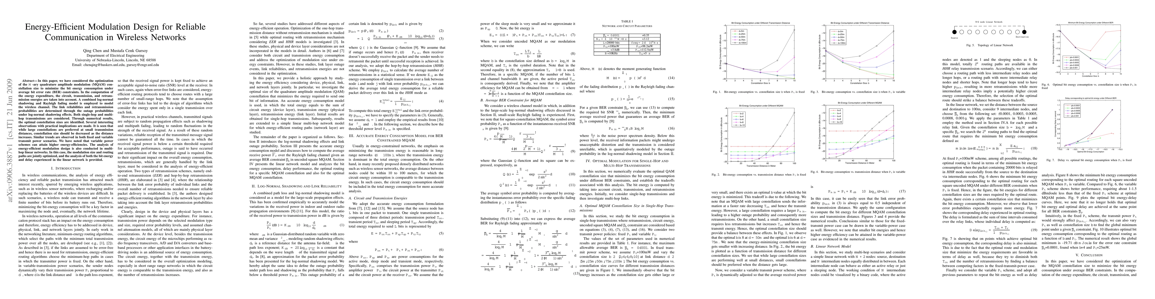 In this paper, we have considered the optimization of the $M$-ary quadrature amplitude modulation (MQAM) constellation size to minimize the bit energy consumption under average bit error rate (BER) constraints. In the computation of the energy expenditure, the circuit, transmission, and retransmission energies are taken into account. A combined log-normal shadowing and Rayleigh fading model is employed to model the wireless channel. The link reliabilities and retransmission probabilities are determined through the outage probabilities under log-normal shadowing effects. Both single-hop and multi-hop transmissions are considered. Through numerical results, the optimal constellation sizes are identified. Several interesting observations with practical implications are made. It is seen that while large constellations are preferred at small transmission distances, constellation size should be decreased as the distance increases. Similar trends are observed in both fixed and variable transmit power scenarios. We have noted that variable power schemes can attain higher energy-efficiencies. The analysis of energy-efficient modulation design is also conducted in multi-hop linear networks. In this case, the modulation size and routing paths are jointly optimized, and the analysis of both the bit energy and delay experienced in the linear network is provided.