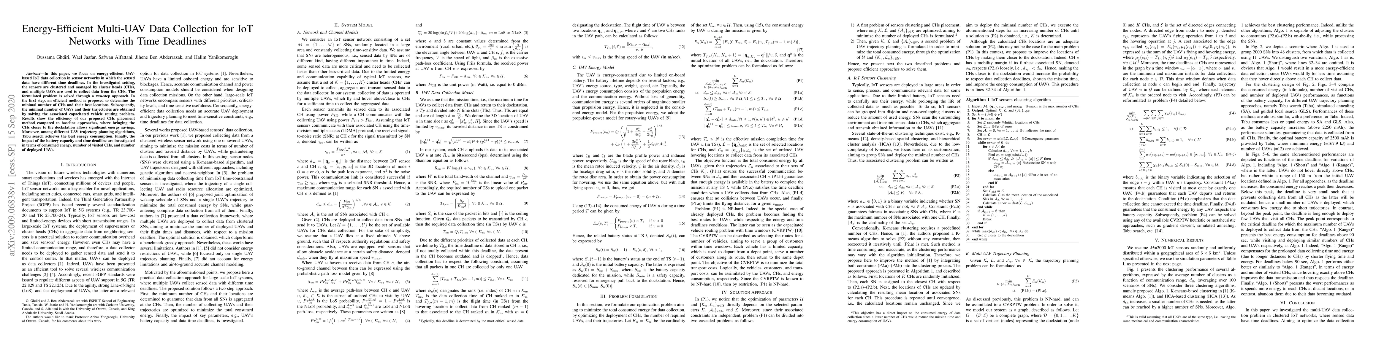 This paper proposes an energy-efficient method for multi-UAV data collection in IoT networks with time-sensitive data, optimizing cluster head placement and UAV routing. The study finds that placing CHs closer to the dockstation reduces energy consumption, with Tabu search outperforming other UAV trajectory algorithms.