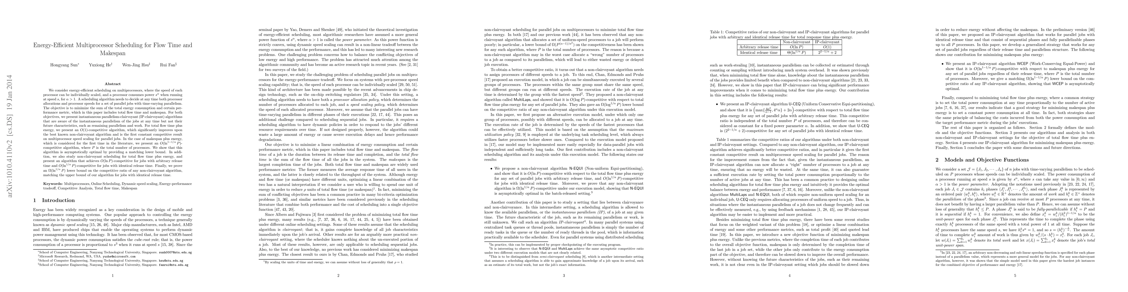 This paper proposes energy-efficient scheduling algorithms for multiprocessor systems to minimize the sum of energy consumption and performance metrics like total flow time and makespan. It introduces clairvoyant algorithms achieving $O(1)$-competitiveness for flow time and $O(\ln^{1-1/\alpha}P)$-competitiveness for makespan, with matching lower bounds. Non-clairvoyant algorithms are also presented for both metrics.