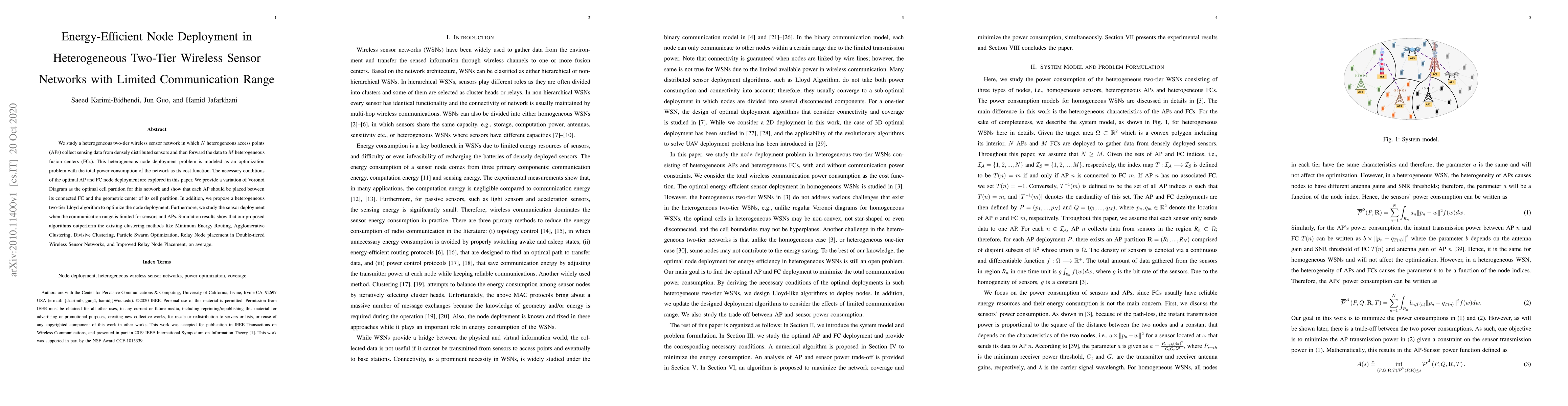 This paper explores energy-efficient deployment strategies for heterogeneous two-tier wireless sensor networks, optimizing the placement of access points and fusion centers to minimize power consumption. It proposes a Voronoi Diagram-based cell partition and a modified Lloyd algorithm, demonstrating superior performance over existing clustering methods in simulations.
