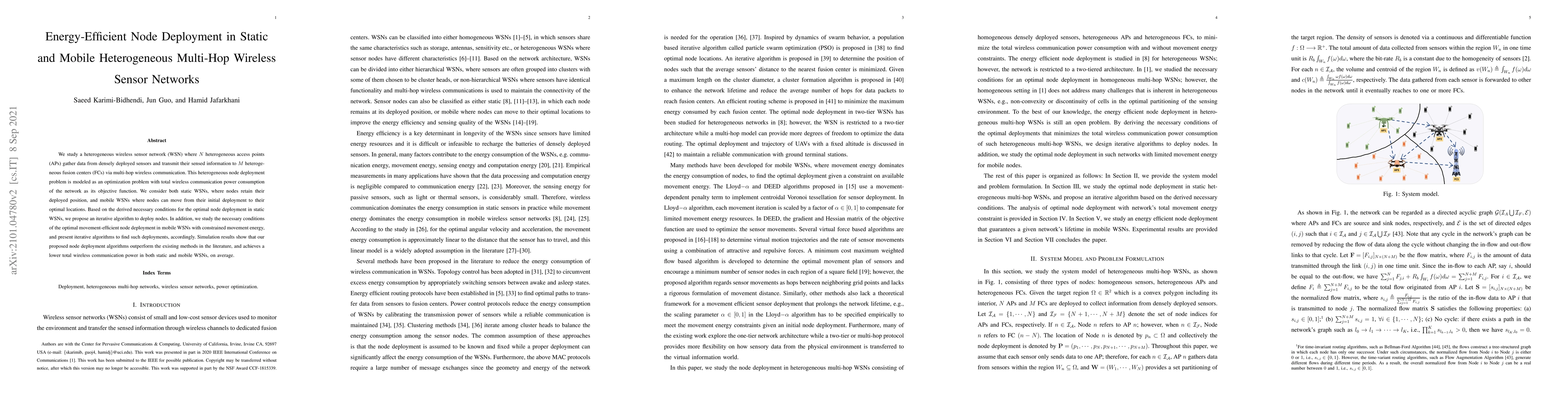 This paper proposes optimization algorithms for energy-efficient node deployment in heterogeneous multi-hop wireless sensor networks, addressing both static and mobile scenarios. The algorithms achieve lower total wireless communication power consumption compared to existing methods.