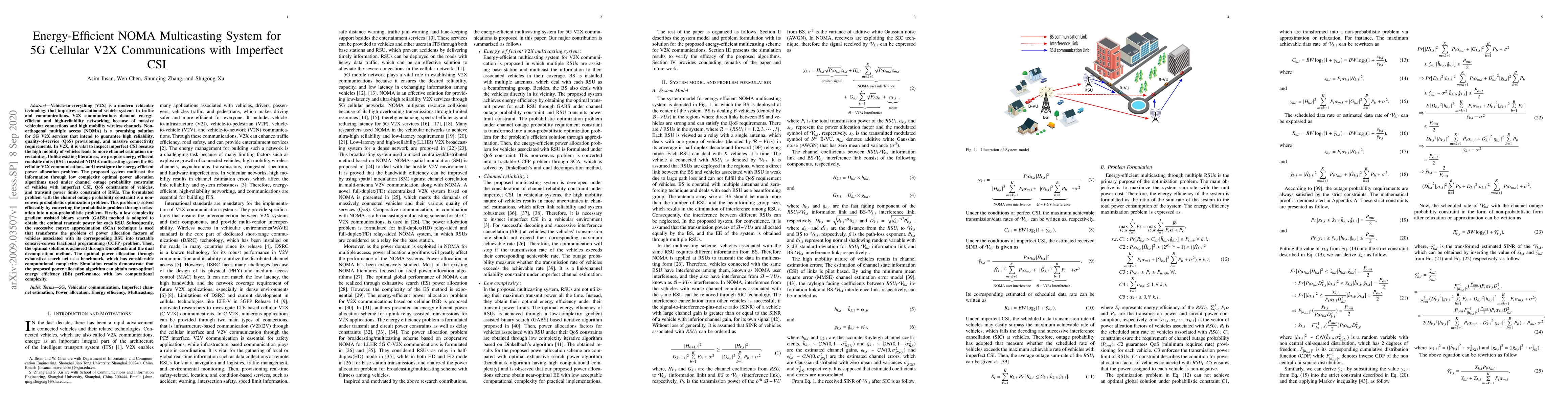 This paper proposes an energy-efficient NOMA multicasting system for 5G V2X communications, focusing on optimizing power allocation under imperfect channel state information (CSI) and quality-of-service constraints. The system employs roadside units to efficiently distribute information, addressing the nonconvex optimization problem through relaxation techniques.