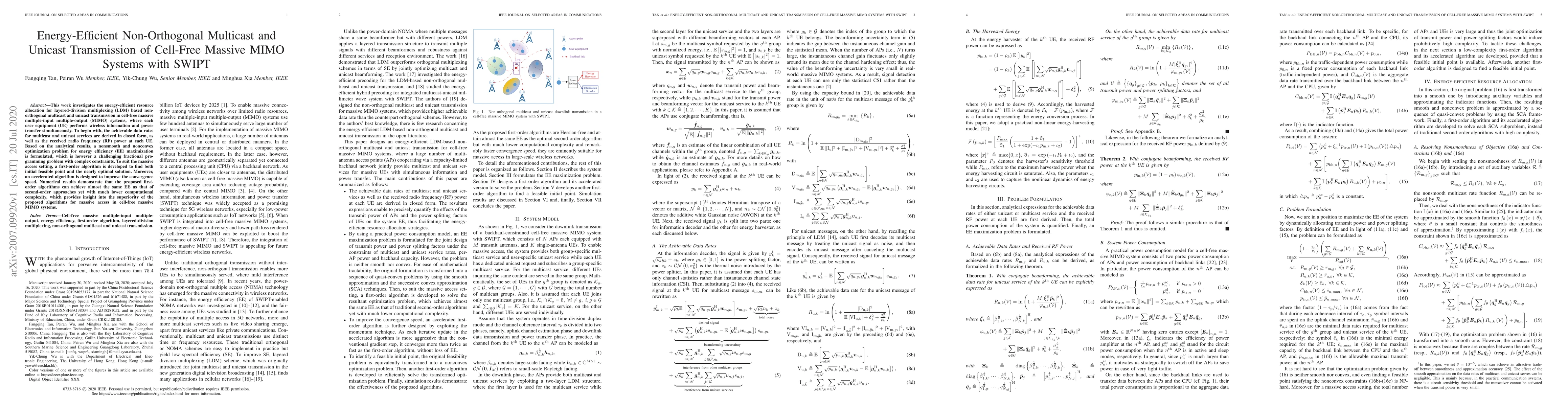 This paper explores energy-efficient resource allocation for non-orthogonal multicast and unicast in cell-free massive MIMO systems with simultaneous wireless information and power transfer (SWIPT). It proposes first-order algorithms to solve the nonconvex optimization problem, achieving near-optimal energy efficiency with significantly lower computational complexity compared to second-order methods.