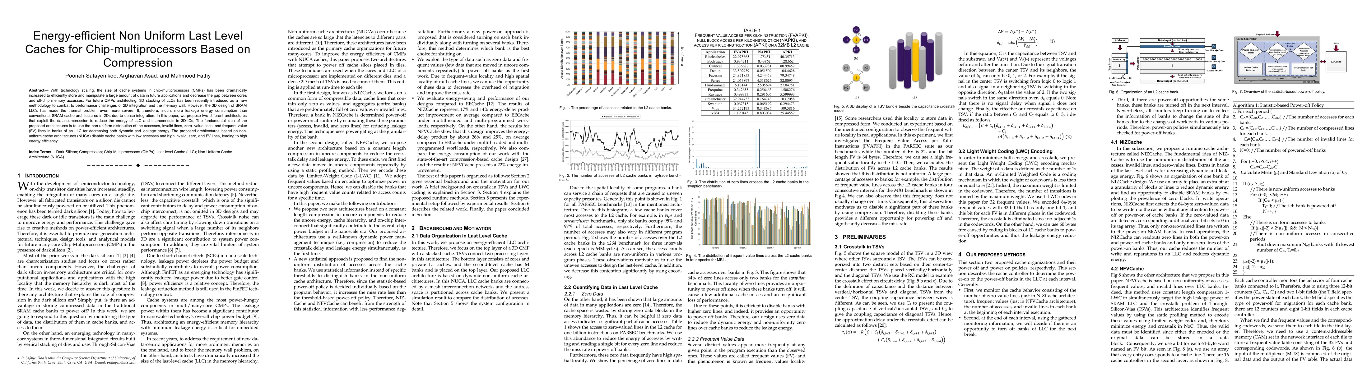 This paper proposes two energy-efficient non-uniform last level cache (LLC) architectures for chip-multiprocessors (CMPs) using data compression to mitigate the increased leakage energy consumption in 3D stacked LLCs. The proposed architectures aim to address the thermal and performance issues arising from the dense integration of 3D SRAM caches.