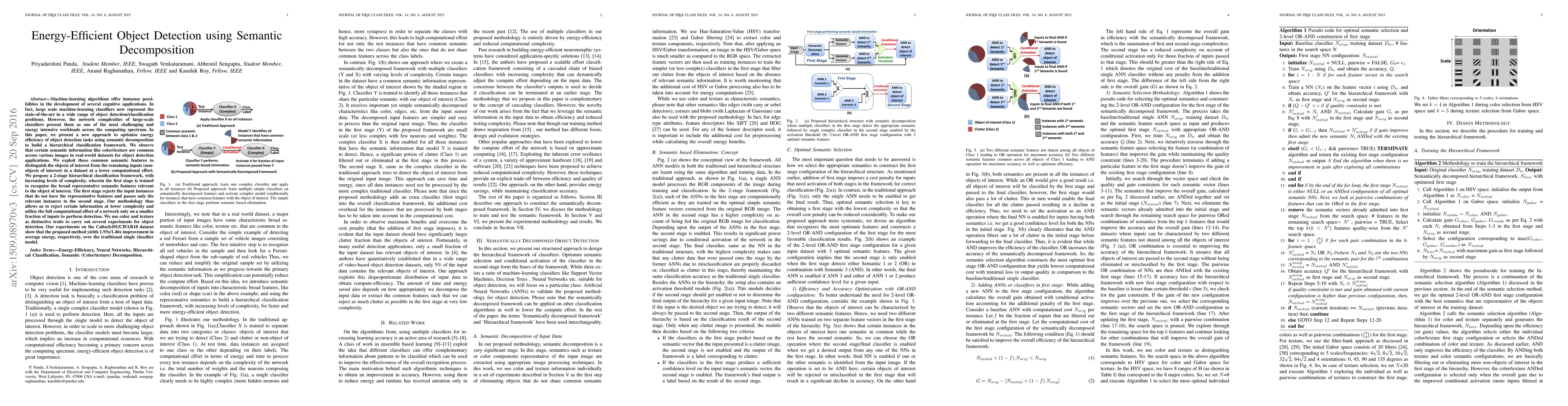 Machine-learning algorithms offer immense possibilities in the development of several cognitive applications. In fact, large scale machine-learning classifiers now represent the state-of-the-art in a wide range of object detection/classification problems. However, the network complexities of large-scale classifiers present them as one of the most challenging and energy intensive workloads across the computing spectrum. In this paper, we present a new approach to optimize energy efficiency of object detection tasks using semantic decomposition to build a hierarchical classification framework. We observe that certain semantic information like color/texture are common across various images in real-world datasets for object detection applications. We exploit these common semantic features to distinguish the objects of interest from the remaining inputs (non-objects of interest) in a dataset at a lower computational effort. We propose a 2-stage hierarchical classification framework, with increasing levels of complexity, wherein the first stage is trained to recognize the broad representative semantic features relevant to the object of interest. The first stage rejects the input instances that do not have the representative features and passes only the relevant instances to the second stage. Our methodology thus allows us to reject certain information at lower complexity and utilize the full computational effort of a network only on a smaller fraction of inputs to perform detection. We use color and texture as distinctive traits to carry out several experiments for object detection. Our experiments on the Caltech101/CIFAR10 dataset show that the proposed method yields 1.93x/1.46x improvement in average energy, respectively, over the traditional single classifier model.