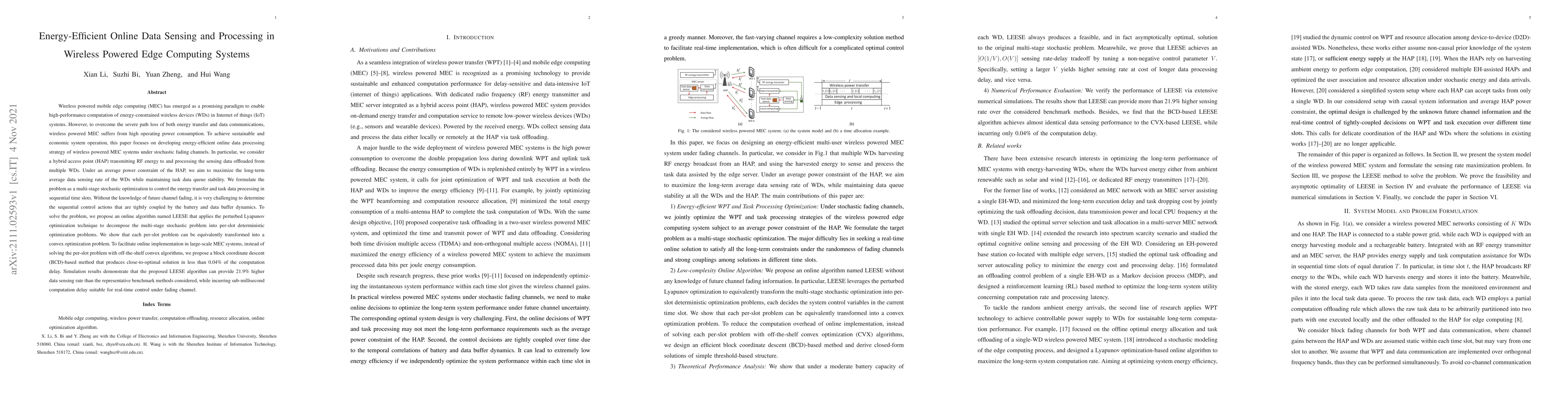 This paper focuses on developing energy-efficient online data processing strategy of wireless powered MEC systems under stochastic fading channels. In particular, we consider a hybrid access point (HAP) transmitting RF energy to and processing the sensing data offloaded from multiple WDs. Under an average power constraint of the HAP, we aim to maximize the long-term average data sensing rate of the WDs while maintaining task data queue stability. We formulate the problem as a multi-stage stochastic optimization to control the energy transfer and task data processing in sequential time slots. Without the knowledge of future channel fading, it is very challenging to determine the sequential control actions that are tightly coupled by the battery and data buffer dynamics. To solve the problem, we propose an online algorithm named LEESE that applies the perturbed Lyapunov optimization technique to decompose the multi-stage stochastic problem into per-slot deterministic optimization problems. We show that each per-slot problem can be equivalently transformed into a convex optimization problem. To facilitate online implementation in large-scale MEC systems, instead of solving the per-slot problem with off-the-shelf convex algorithms, we propose a block coordinate descent (BCD)-based method that produces close-to-optimal solution in less than 0.04\% of the computation delay. Simulation results demonstrate that the proposed LEESE algorithm can provide 21.9\% higher data sensing rate than the representative benchmark methods considered, while incurring sub-millisecond computation delay suitable for real-time control under fading channel.