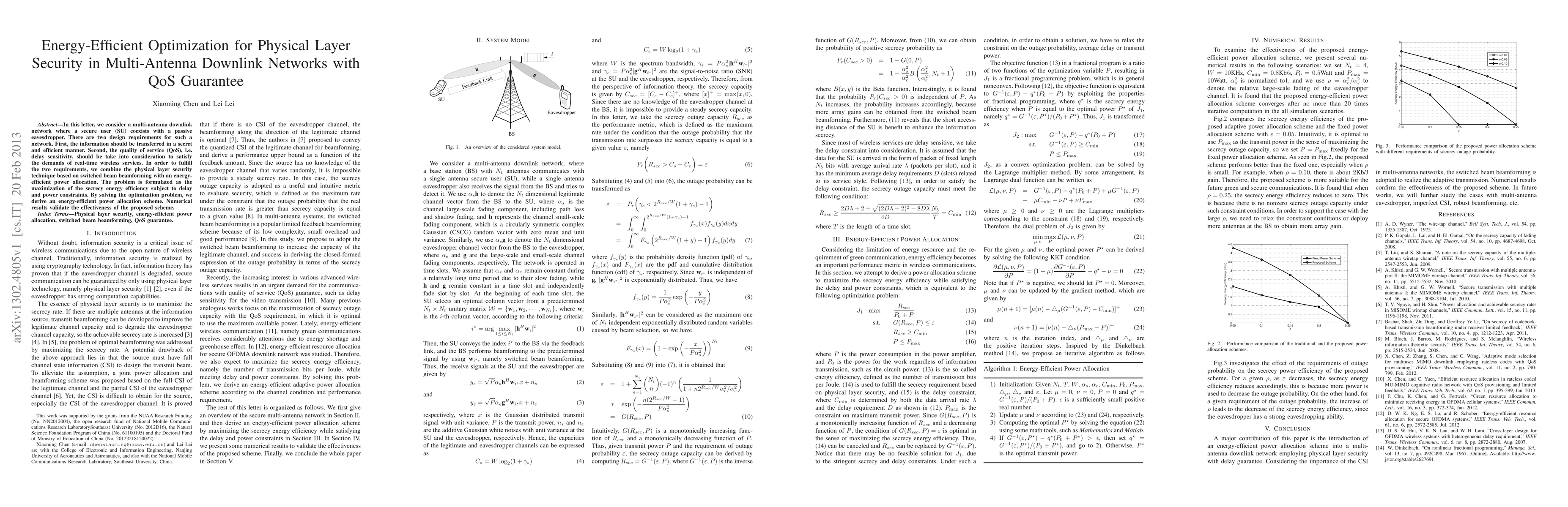 This paper proposes an energy-efficient optimization scheme for multi-antenna downlink networks that ensures secure communication between a transmitter and a secure user while considering passive eavesdroppers and quality of service (QoS) requirements. The scheme combines physical layer security with switched beam beamforming and energy-efficient power allocation to maximize secrecy energy efficiency under delay and power constraints.