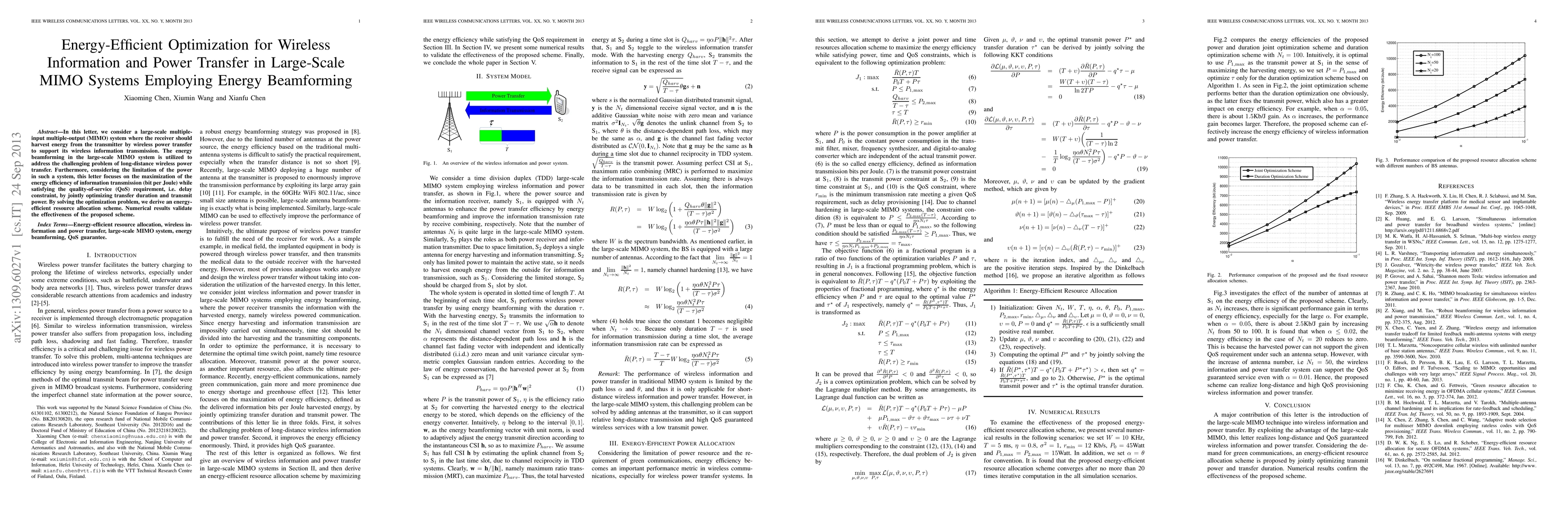 This paper proposes an energy-efficient optimization scheme for wireless information and power transfer in large-scale MIMO systems using energy beamforming. The focus is on maximizing energy efficiency while satisfying delay constraints through joint optimization of transfer duration and transmit power.
