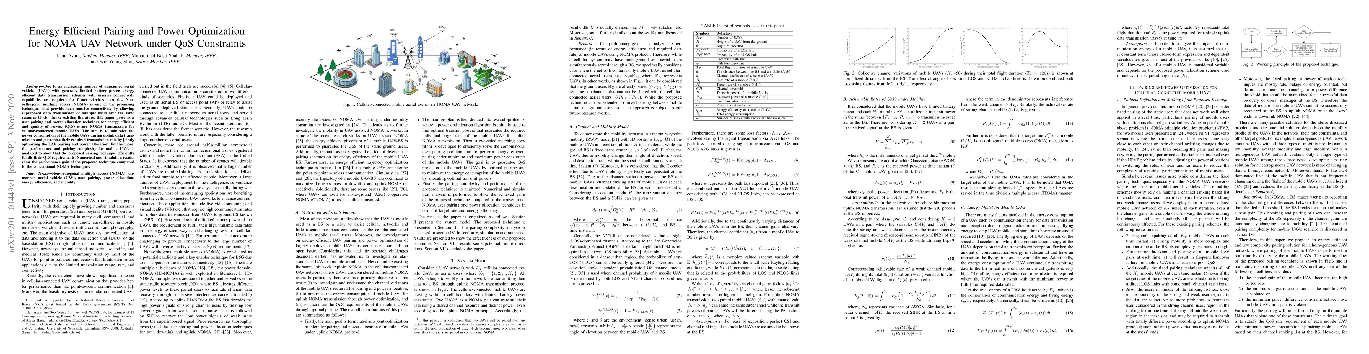 Due to an increasing number of unmanned aerial vehicles (UAVs) with generally limited battery power, energy efficient data transmission schemes with massive connectivity capabilities are required for future wireless networks. Non-orthogonal multiple access (NOMA) is one of the promising techniques that provide such massive connectivity by allowing superposed data transmission of multiple users over the same resource block. Unlike existing literature, this paper presents a user pairing and power allocation technique for energy efficient and quality of service (QoS) aware NOMA transmission for cellular-connected mobile UAVs. The aim is to minimize the power consumption of the mobile UAVs during uplink data transmission and guarantee their required transmission rate by jointly optimizing the UAV pairing and power allocation. Furthermore, the performance and pairing complexity for mobile UAVs is analyzed to show that the proposed pairing technique efficiently fulfills their QoS requirements. Numerical and simulation results show the performance gain of the proposed technique compared to the conventional NOMA techniques.