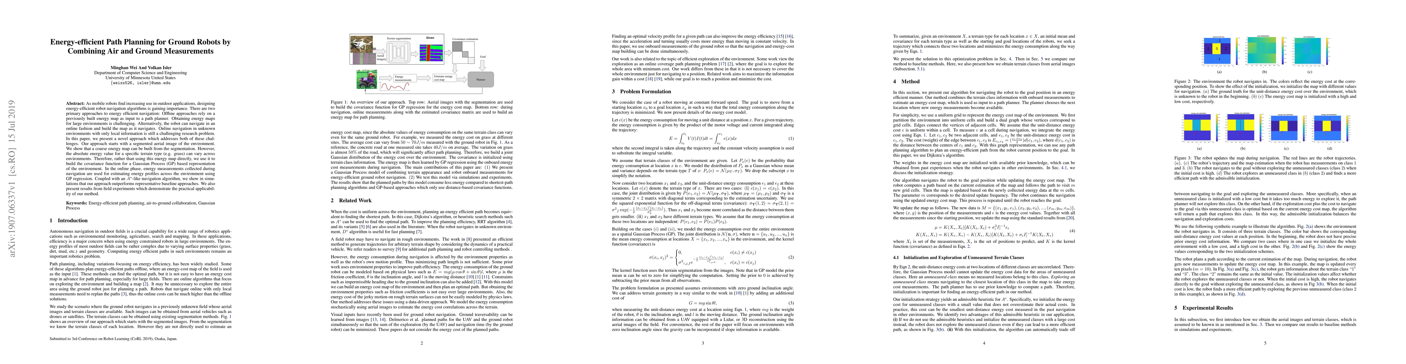 This paper proposes a hybrid energy-efficient path planning method for ground robots that combines aerial imagery and ground measurements. It uses a segmented aerial image to create a coarse energy map, which is then refined using Gaussian Process regression with online measurements, leading to improved navigation performance compared to baseline methods, as shown in both simulations and field experiments.