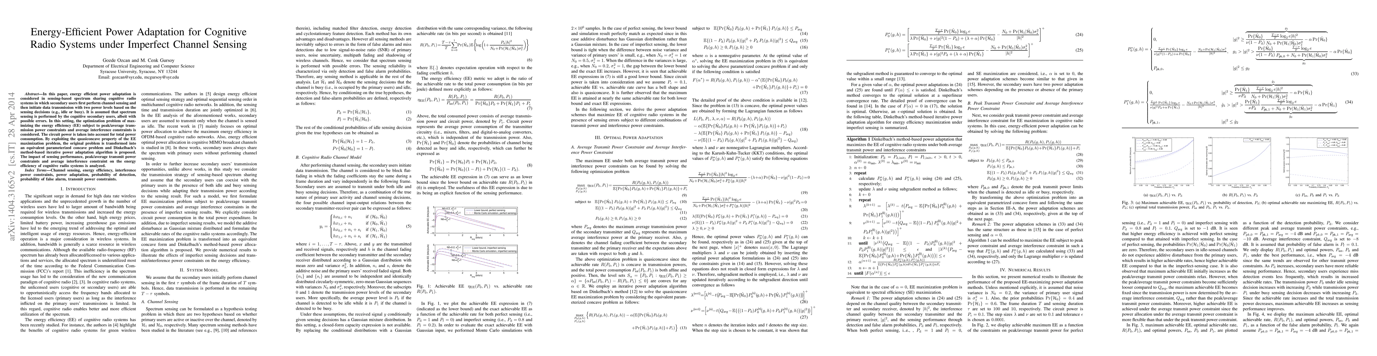 This paper proposes an iterative power adaptation algorithm to maximize energy efficiency in cognitive radio systems under imperfect channel sensing. The algorithm addresses peak/average transmission power and interference constraints, considering circuit power, and leverages the quasiconcave property of the optimization problem. The study analyzes how sensing performance and power constraints impact energy efficiency.