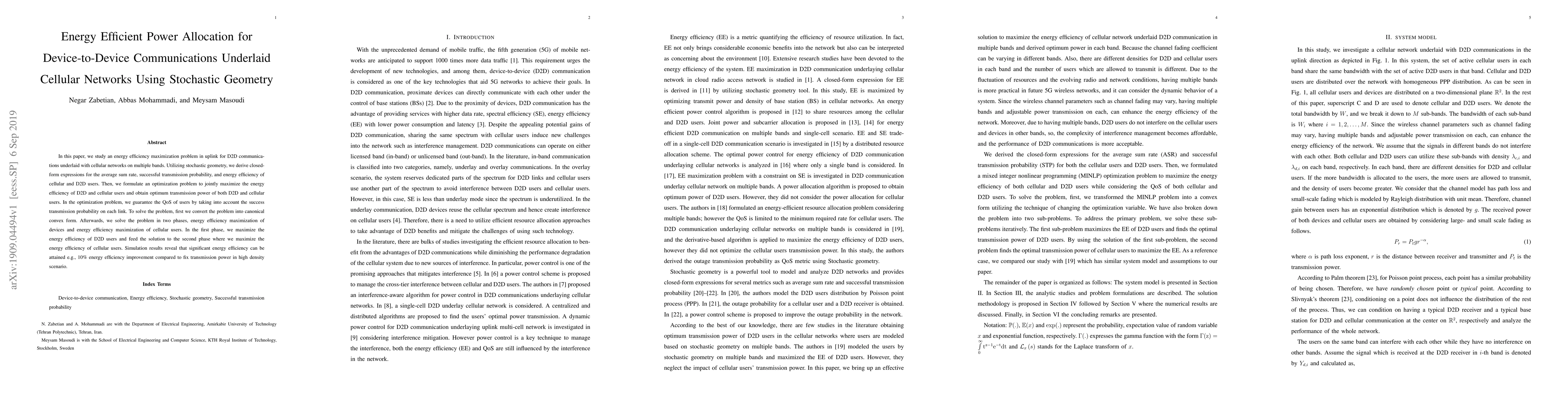 This paper investigates energy efficiency maximization in uplink D2D communications underlaid with cellular networks using stochastic geometry. The authors derive expressions for average sum rate and energy efficiency, formulate an optimization problem to jointly maximize efficiency, and solve it in two phases, achieving up to a 10% energy efficiency improvement in high-density scenarios.