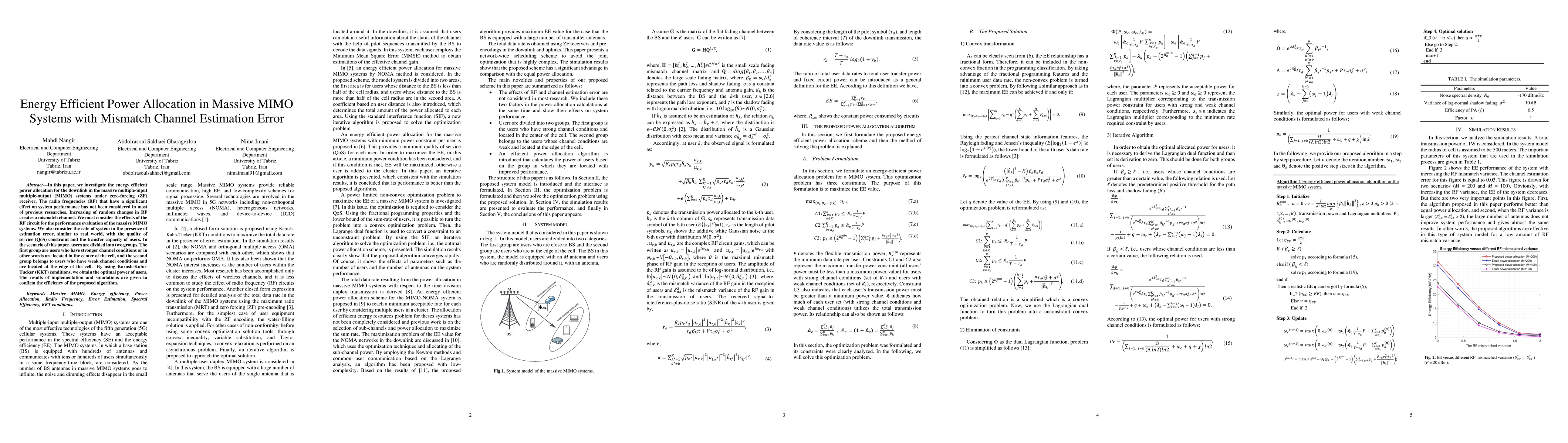 This paper explores energy efficient power allocation in massive MIMO systems under zero-forcing receivers, considering RF circuit mismatch and channel estimation errors. Using KKT conditions, it optimizes power allocation for users divided into strong and weak channel condition groups, demonstrating improved efficiency through simulations.