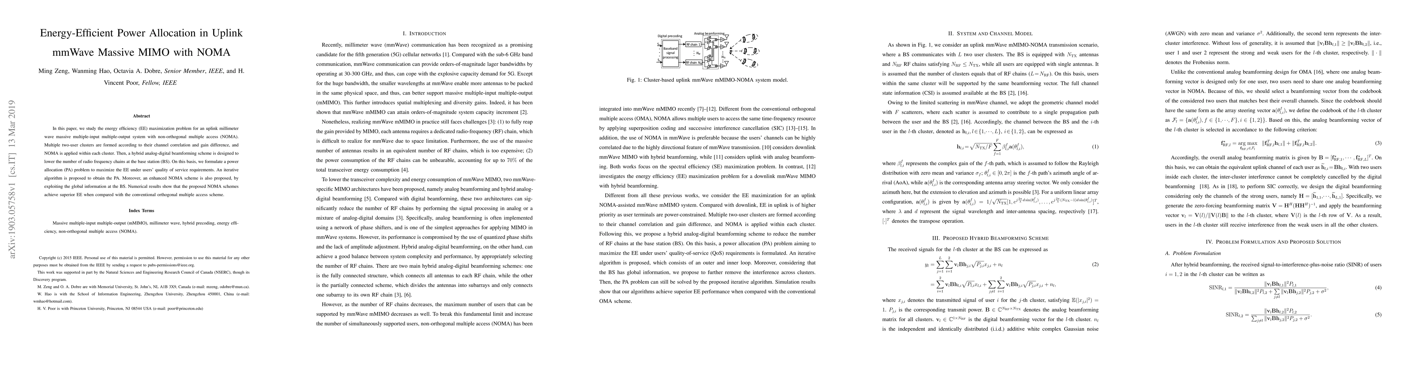 This paper proposes an energy-efficient power allocation strategy for uplink mmWave massive MIMO with NOMA, utilizing hybrid beamforming to reduce RF chains. An iterative algorithm maximizes energy efficiency, and enhanced NOMA schemes outperform conventional orthogonal multiple access in numerical results.