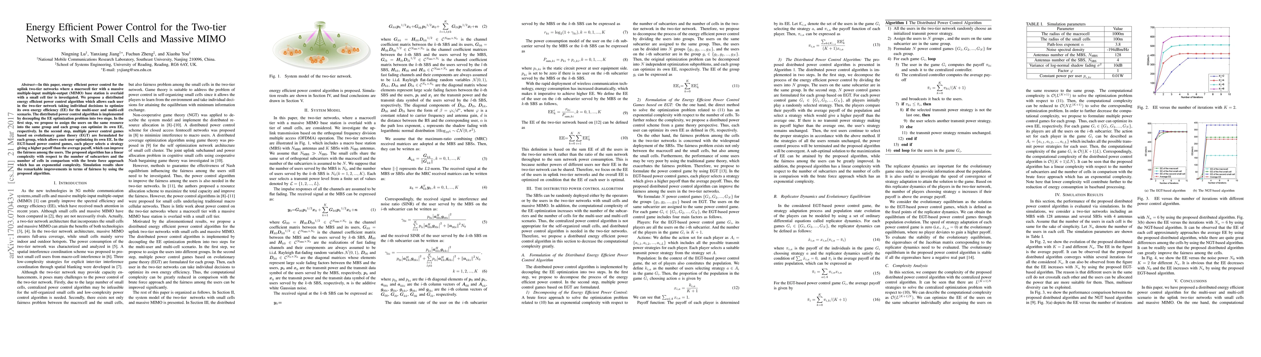 This paper proposes a distributed energy efficient power control algorithm for uplink two-tier networks with massive MIMO macrocells and small cells. The algorithm optimizes individual user energy efficiency through evolutionary game theory, achieving linear complexity and improved fairness compared to brute force methods.