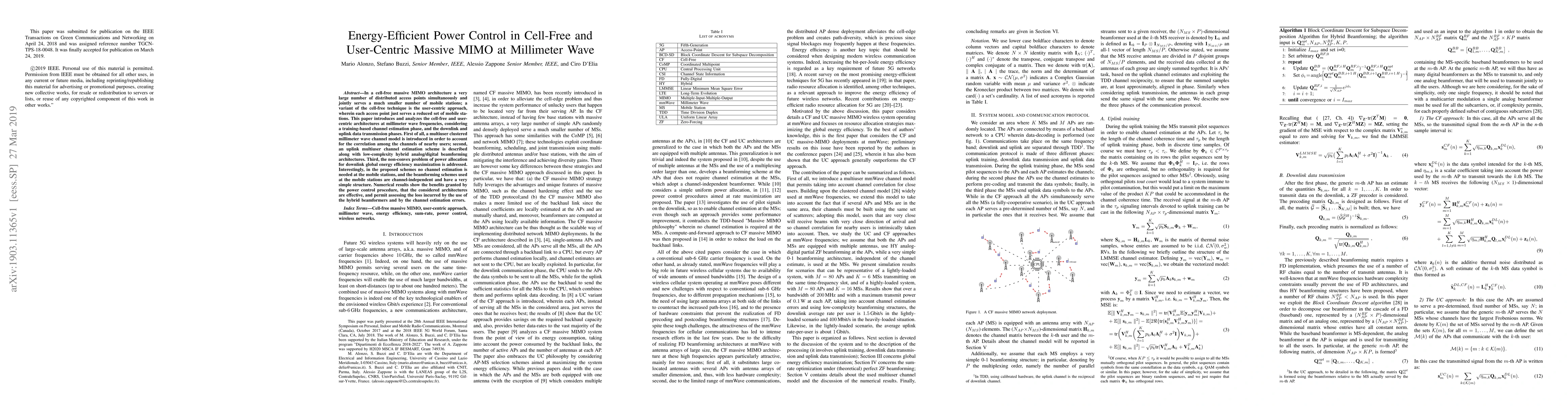 This paper explores energy-efficient power control in cell-free and user-centric massive MIMO systems operating at millimeter wave frequencies, proposing low-complexity hybrid beamforming and channel estimation schemes that maximize downlink global energy efficiency without requiring channel estimation at mobile stations. Numerical results demonstrate the effectiveness of the proposed architectures and quantify the impact of hybrid beamformers and channel estimation errors.