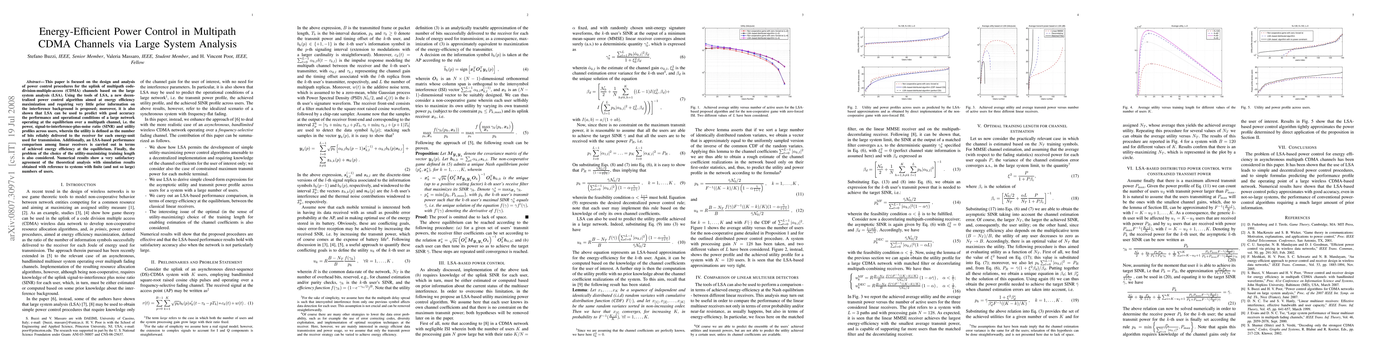 This paper proposes a decentralized power control algorithm for multipath CDMA channels using large system analysis (LSA) to maximize energy efficiency with minimal prior interference information. It also demonstrates LSA's accuracy in predicting network performance and operational conditions, including power, SINR, and utility profiles.