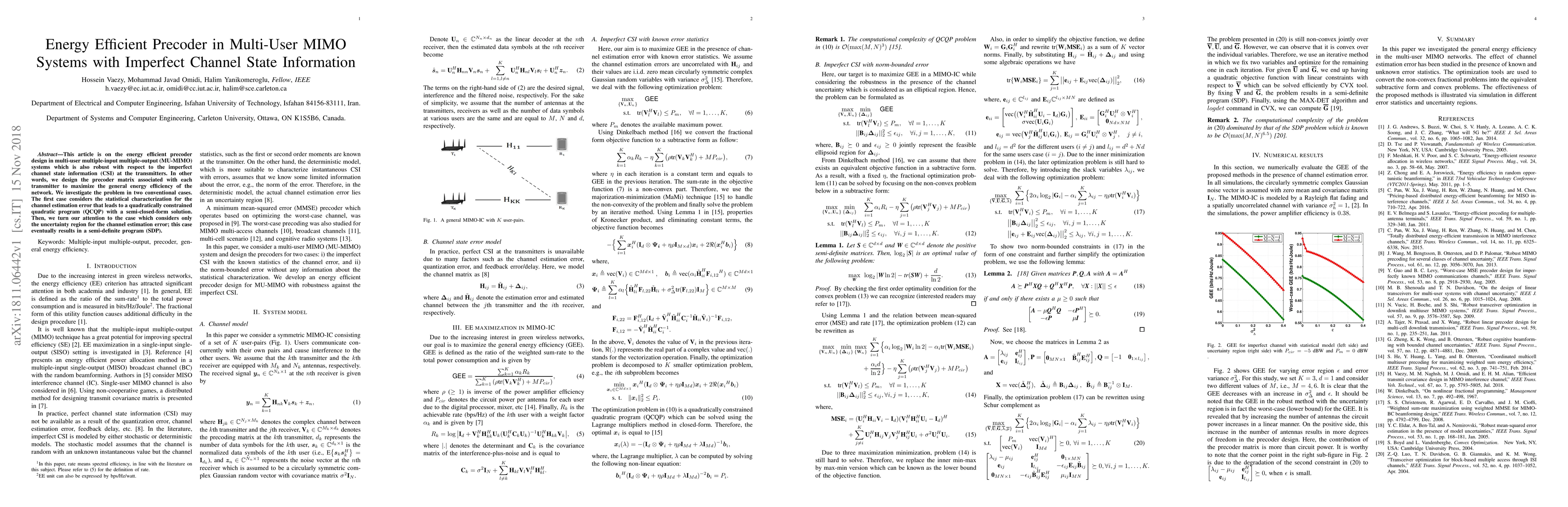 This research presents energy-efficient precoder designs for multi-user MIMO systems, addressing imperfect channel state information (CSI) at transmitters. It solves the problem as two cases: one with statistical channel error characterization leading to a semi-closed-form QCQP solution, and another with channel uncertainty region resulting in an SDP. These methods aim to maximize network energy efficiency while considering CSI imperfections.