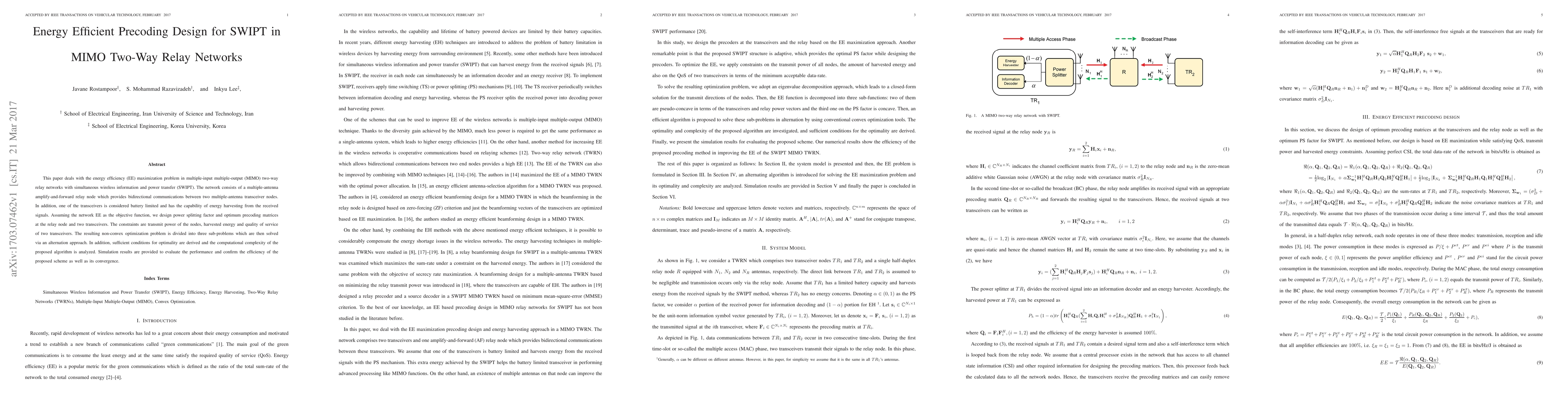This paper investigates energy efficiency maximization in MIMO two-way relay networks utilizing SWIPT, focusing on optimizing precoding design for the amplify-and-forward relay to enhance both information transfer and power harvesting. The goal is to achieve efficient energy usage while maintaining robust communication between the two transceiver nodes.
